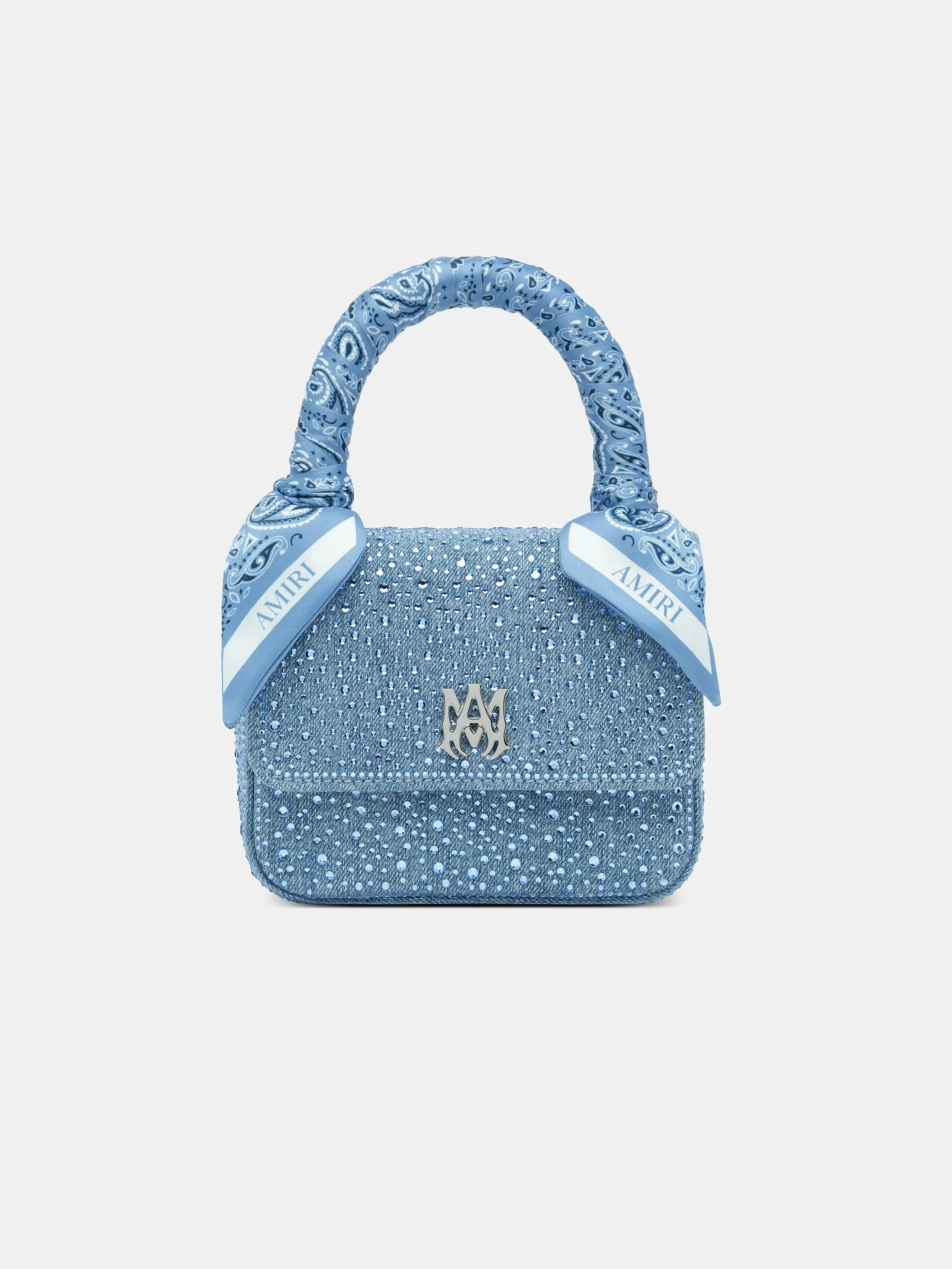 PRE-FALL 2024 CONTINUES TO EXPLORE HOUSE SIGNATURE MOTIFS IN NOVEL INTERPRETATIONS. THE CRYSTAL DENIM MICRO MA BAG IS ADORNED WITH CRYSTAL EMBELLISHMENTS AND FINISHED WITH CHROME MA ICON HARDWARE, TIED PAISLEY SCARF ACCENTS, A TOP HANDLE, AND A DETACHABLE DENIM SHOULDER STRAP. PRE-FALL 2024 COLLECTION MADE IN ITALY 100% COTTON