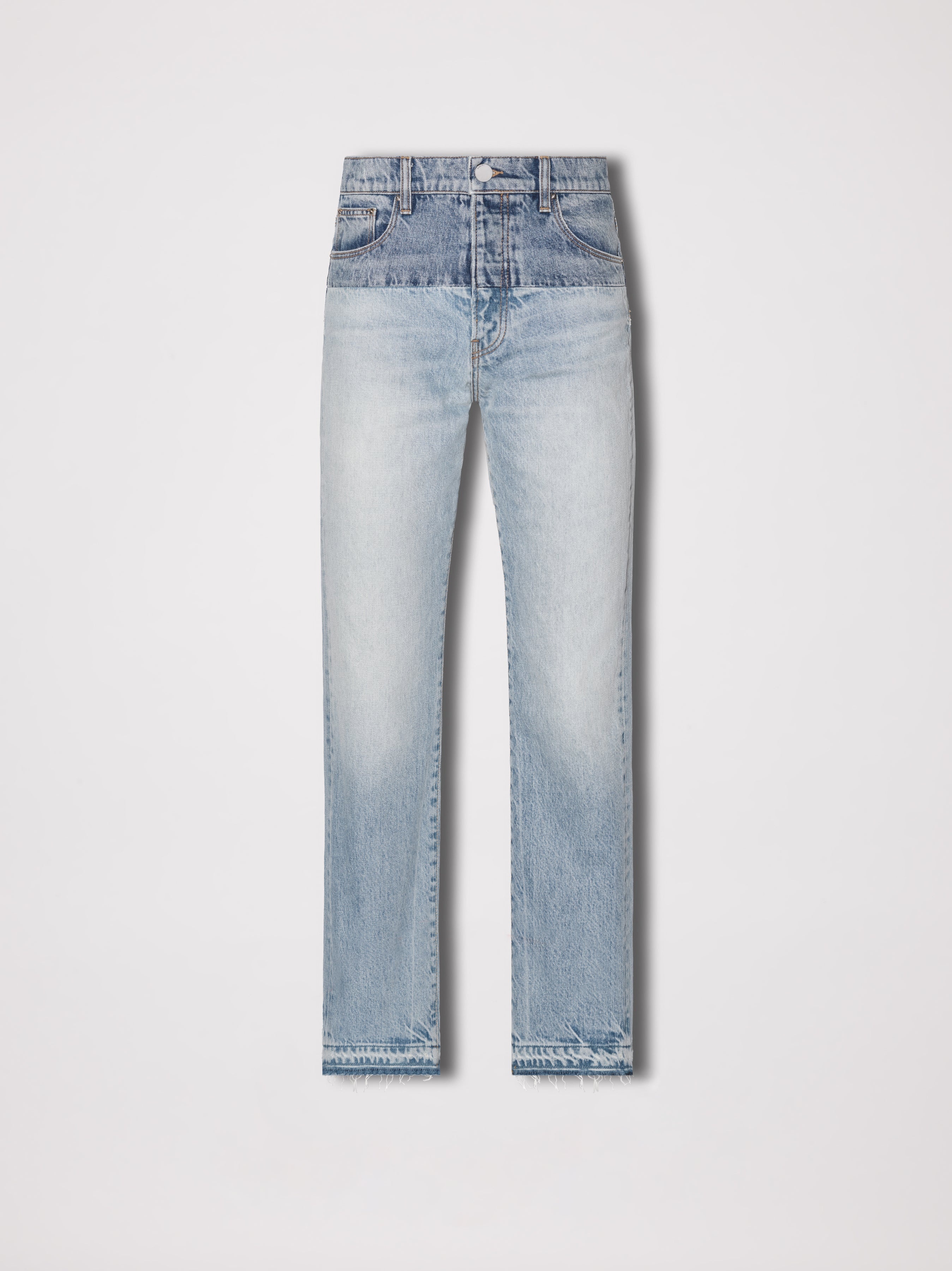ITALIAN DENIM STRAIGHT LEG JEANS COLOR CONTRAST WAISTBAND RAW HEM MADE IN LOS ANGELES, CALIFORNIA STRAIGHT LEG FIT MODEL WEARS A SIZE 26 DETAILS & CARE BUTTON FLY ITALIAN RIGID DENIM 100% COTTON DRY CLEANING RECOMMENDED