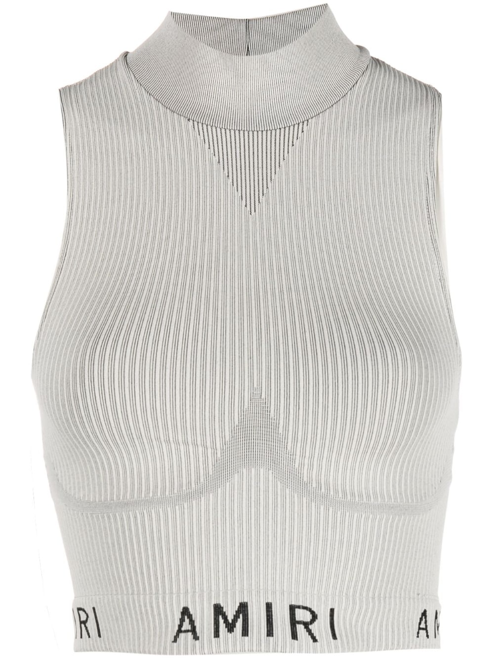 logo-print high-neck top This light grey high-neck top shows AMIRI's bold artistic vision. It has a stretch design, with ribbed detailing throughout, and is enhanced by a logo waistband. Highlights - Light grey - Stretch-design - Ribbed detailing - Logo waistband - High neck - Sleeveless Made in Italy Composition Polyethylene 67%, Polyamide 26% SIZE & FIT Model measurements Height 5 ft 10 in(1.77 m) Bust/Chest 32.3 in(82 cm) Hips 36.2 in(92 cm) Waist 24.4 in(62 cm) FittingInformation Designed for a close fit throughout Constructed with a narrow neckline Made from a midweight stretch fabric, this piece offers elasticity and flexibility when worn This piece fits true to size – take your usual size