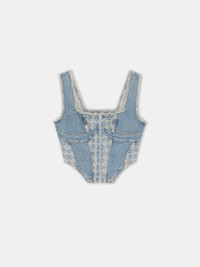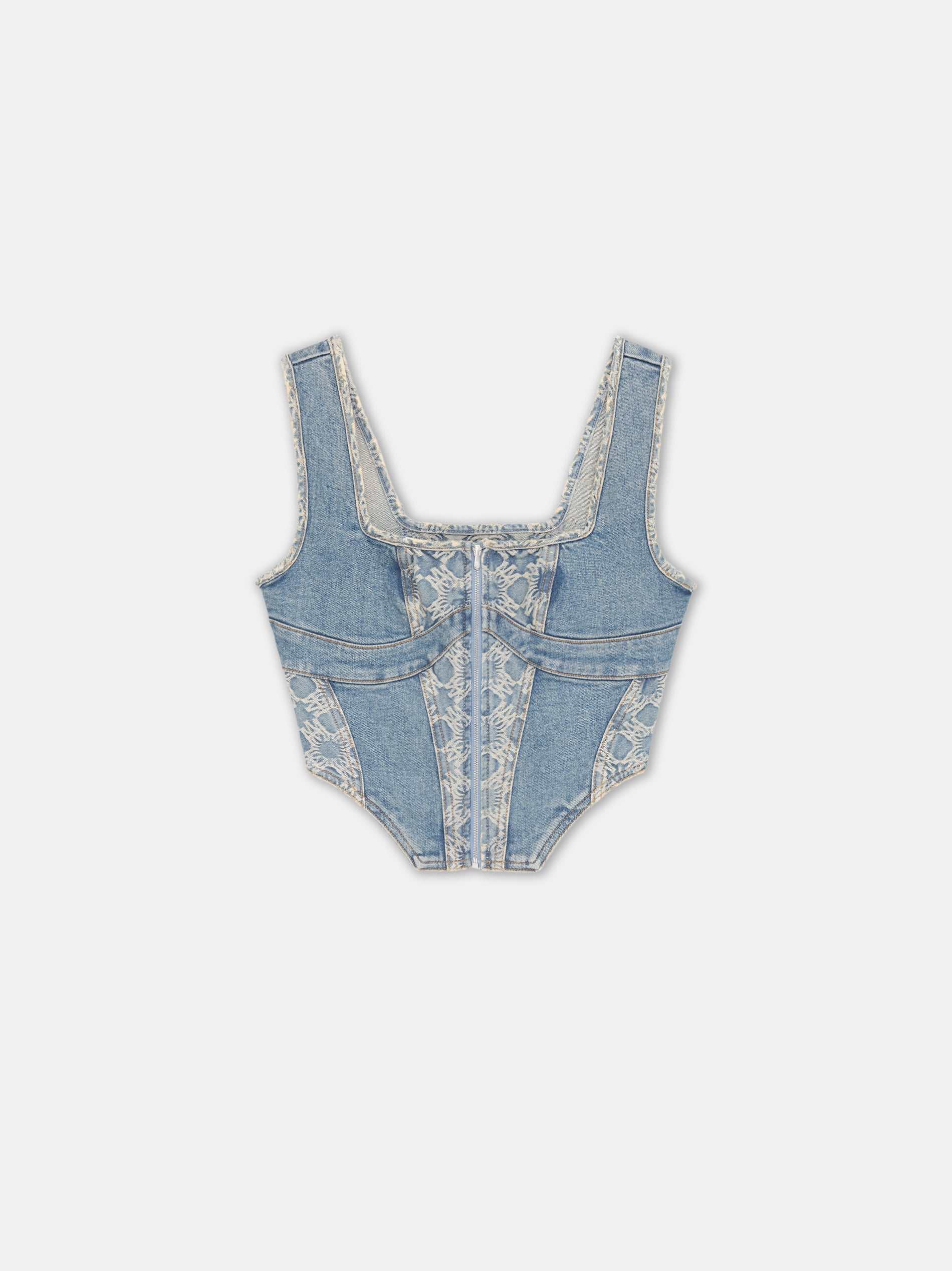 AUTUMN-WINTER 2024 MARKS THE INCEPTION OF THE MA QUAD MONOGRAM, A NEW HOUSE SIGNATURE. THE MA QUAD CORSET TOP IS CRAFTED FROM JACQUARD DENIM WITH PANELED CORSET CONSTRUCTION AND DOUBLE-ZIP CLOSURE. AUTUMN-WINTER 2024 COLLECTION MADE IN USA 97% COTTON, 3% ELASTANE