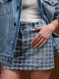 FOR SPRING-SUMMER 2025 WOMENSWEAR, DENIM BECOMES A CANVAS FOR INTRICATE PATTERNS AND SUBTLE FABRICATION PROCESSES. THE MA QUAD JACQUARD MINI SKIRT IS DESIGNED IN CUSTOM-WOVEN JACQUARD DENIM WITH BUTTON CLOSURE AND MA ICON HARDWARE. SPRING-SUMMER 2025 COLLECTION MADE IN ITALY 100% COTTON STYLE:AWDNKR1006-765 SIZE & FIT MODEL IS WEARING SIZE "26" MODEL MEASUREMENTS: HEIGHT: 5'10.5" CHEST: 30" WAIST: 23" HIP: 35" PRODUCT MEASUREMENTS (SIZE "26"): WAIST: 27" RISE: 12.625" HIP: 36.75" NORMAL FIT