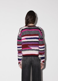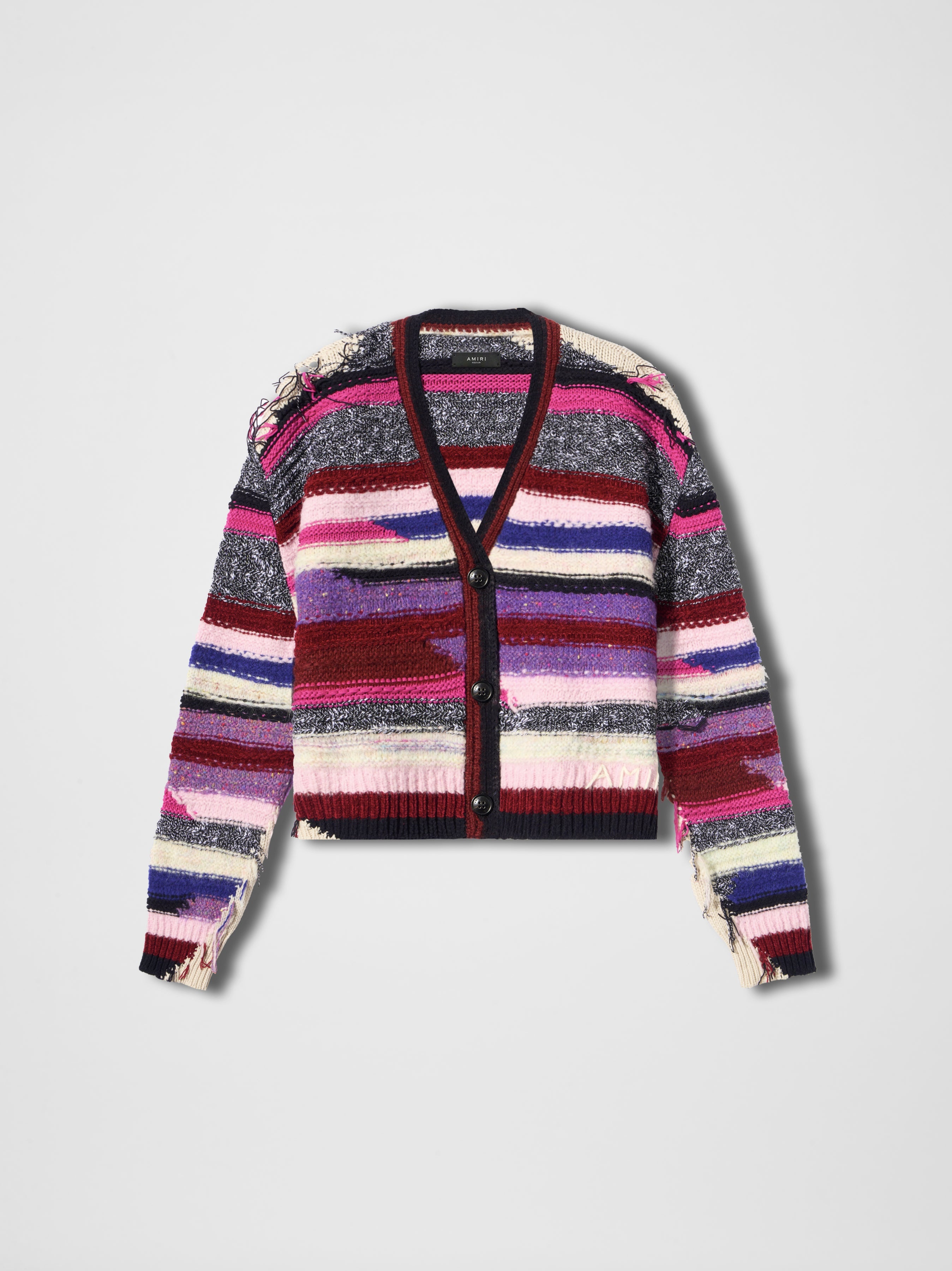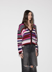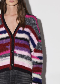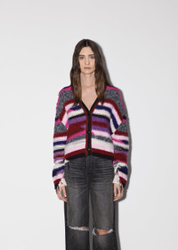WOMENS MULTI YARN STRIPED CARDIGAN MADE IN ITALY MULTI BLEND MODEL WEARS A SIZE SMALL 68% COTTON, 27% POLYESTER, 5% AF DRY CLEAN RECOMMENDED