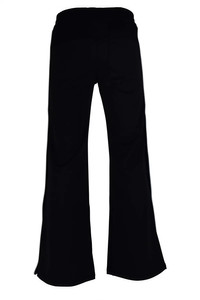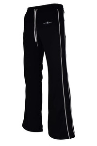 Amiri pants in black polyester and cotton. Black cotton top yoke. Black polyester bottom yoke. White MA logo print. White line detail along legs. Side pockets. One back pocket. Elasticated drawcord waist. Black logo patch on back. Made in Italy.