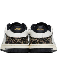 Low-top paneled grained leather and logo-woven twill sneakers in white and black. · Perforated detailing at toe · Lace-up closure · Logo patch at padded tongue · Padded collar · Graphic appliques at sides · Logo embossed at heel tab and midsole · Mesh lining · Treaded rubber sole Supplier color: Black Upper: leather, textile. Sole: rubber. Made in Viet Nam 251886F128035