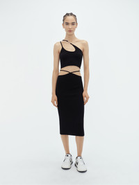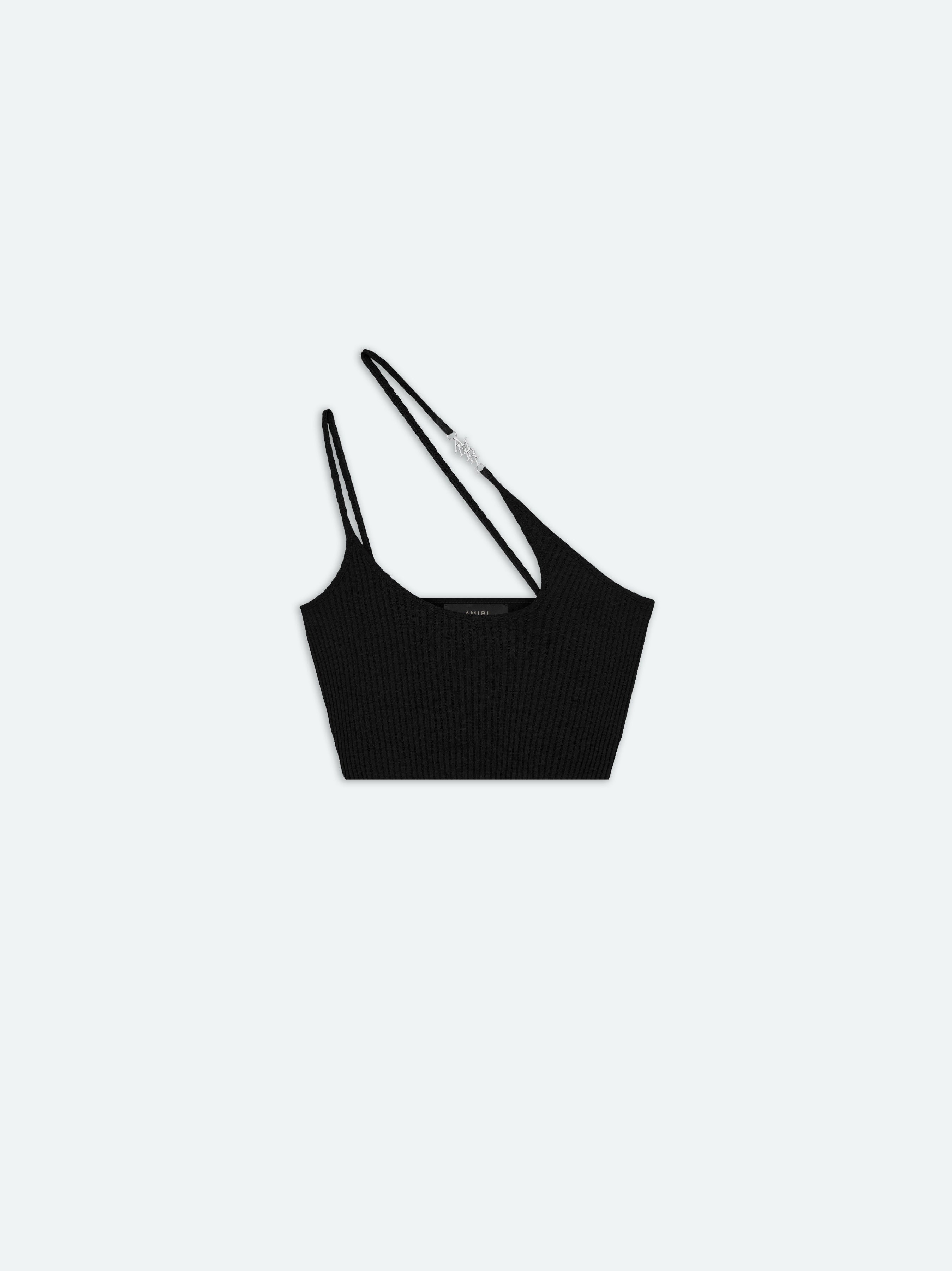 CUSTOM VERTICAL LOGO ACCENTS ADD A DECISIVE ELEMENT TO THIS ASYMMETRICAL TOP IN SUMPTUOUSLY SOFT KNIT COTTON SILK. DESIGNED IN A FINE RIB WITH ADJUSTABLE STRAPS FOR UTMOST COMFORT, THIS ONE-SHOULDER TOP FEATURES A DYNAMIC NECKLINE. THIS TOP PAIRS SEAMLESSLY WITH THE MATCHING AMIRI STAGGERED MIDI SKIRT FOR AN EYE-CATCHING ENSEMBLE. SPRING-SUMMER 2024 COLLECTION MADE IN ITALY 80% COTTON, 20% SILK DRY CLEAN