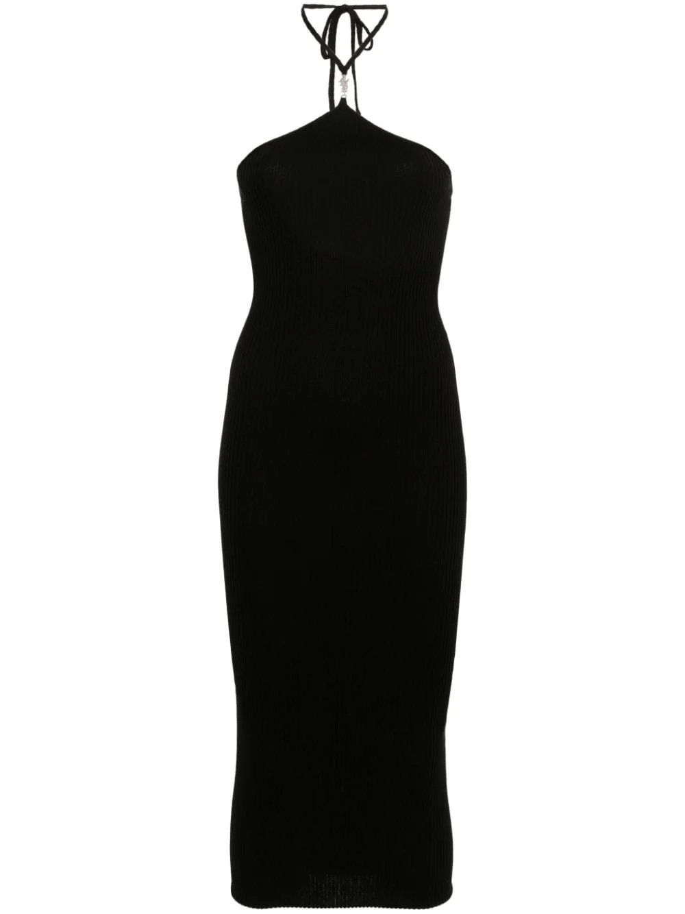 logo-plaque midi dress Highlights - Black - Cotton-silk blend - Knitted construction - Fine ribbed - Halterneck tie fastening - Silver-tone logo plaque - Strapless - Open back - Full lining Made in Italy Composition Cotton 80%, Silk 20% SIZE & FIT Model measurements Height 5 ft 8 in(1.73 m) Bust/Chest 29.92 in(76 cm) Hips 33.07 in(84 cm) Waist 23.22 in(59 cm) FittingInformation Designed for a close fit throughout Made with a lightweight knit, this piece offers some stretch This piece fits true to size – take your usual size Measurement HIPS 24.01 in(61 cm) LENGTH 50 in(127 cm) WAIST 24.01 in(61 cm) BUST 24.01 in(61 cm)