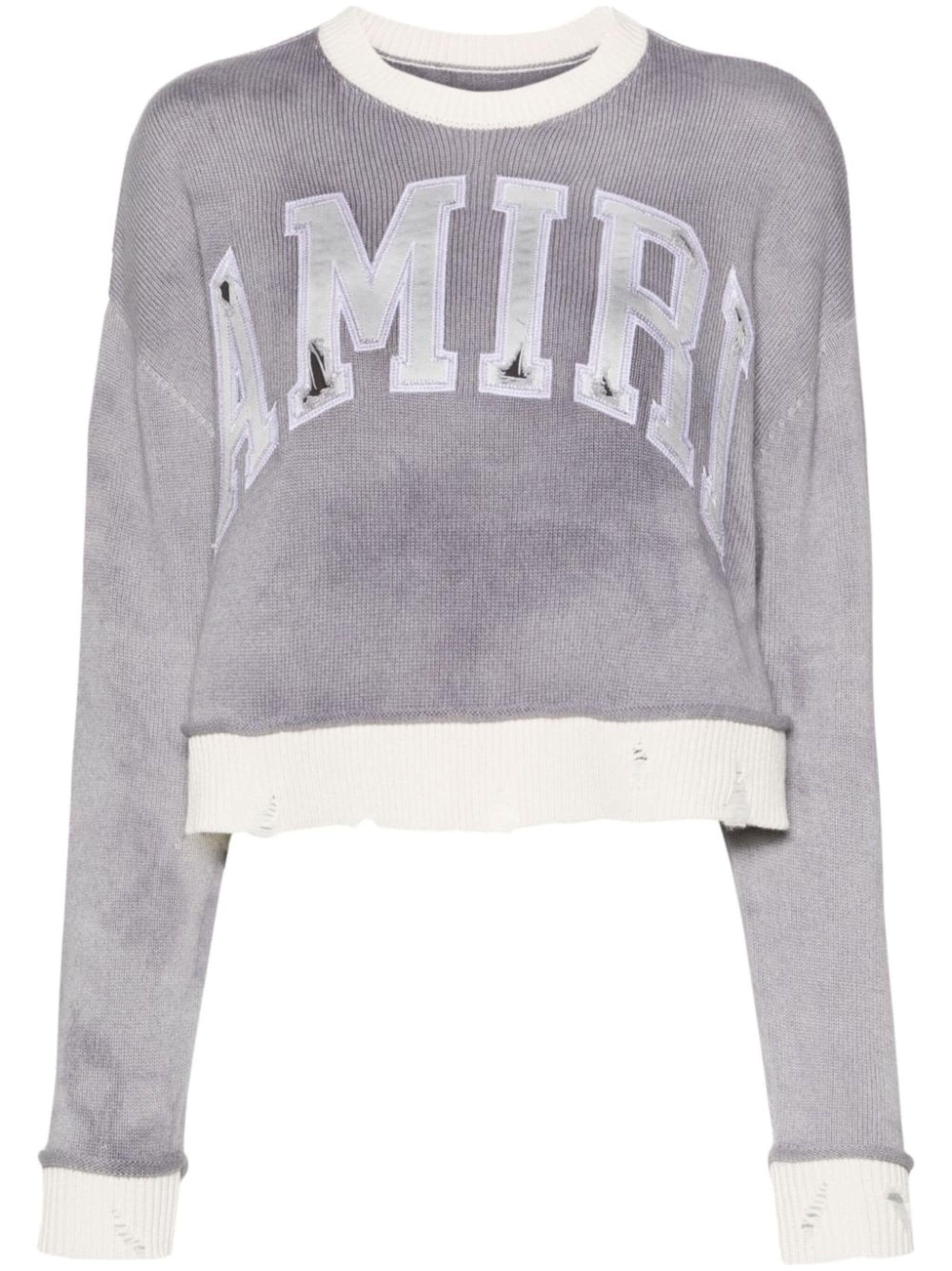 grey cashmere knitted construction ripped detailing logo patch to the front contrasting ribbed trim crew neck drop shoulder long sleeves straight hem cropped Size & Fit Model Measurements: Bust: 0cm Height: 0cm Hips: 0cm Waist: 0cm