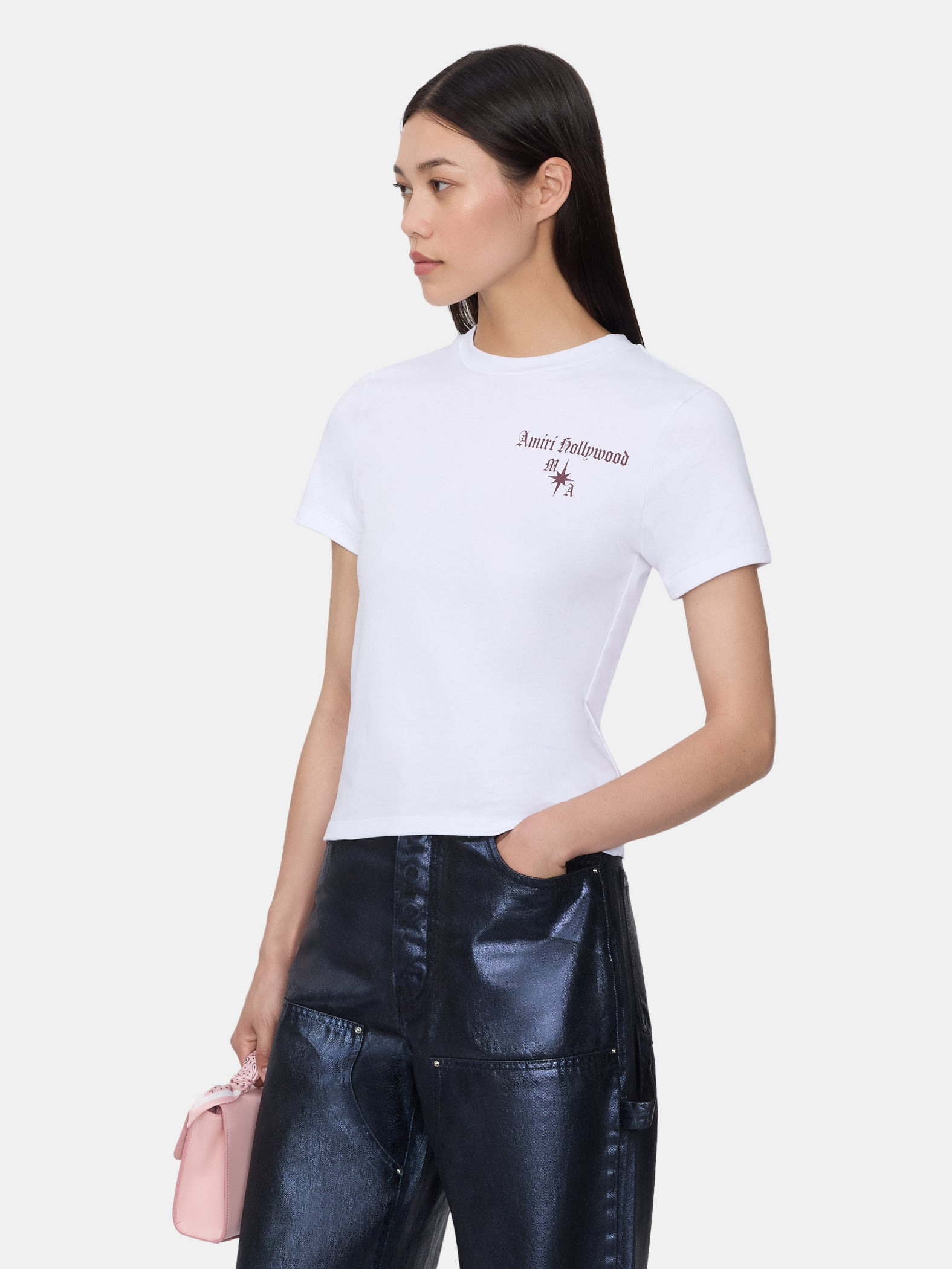 FOR AUTUMN-WINTER 2025, THE SPIRIT OF LOS ANGELES REMAINS AT THE HEART OF AMIRI, WITH GRAPHICS THAT IDEALIZE A FICTIONAL HOLLYWOOD VENUE. THE AMIRI HOLLYWOOD GOTHIC TEE IN COTTON IS DESIGNED IN A STRAIGHT FIT AND ILLUSTRATED WITH SEASONAL VISUALS. AUTUMN-WINTER 2025 COLLECTION MADE IN ITALY 100% COTTON THIS GARMENT HAS UNDERGONE A SPECIAL PROCESS WHICH RESULTS IN INTENTIONAL VARIATIONS OF SHADING AND COLOR, AND ADD TO THE PIECE'S UNIQUE CHARACTERISTICS. THIS MAY LEAD TO BLEEDING OR DYE TRANSFER. PLEASE USE CAUTION WHEN WASHING OR DRY-CLEANING THIS ITEM STYLE:AWJYTE1080-100 SIZE & FIT MODEL MEASUREMENTS: HEIGHT: 5’9.5" CHEST: 31.5" WAIST: 23.5" HIP: 35" PRODUCT MEASUREMENTS (SIZE XS): CHEST: 16.5" SHOULDER: 14.5" LENGTH: 22" SLEEVE LENGTH: 6.75"