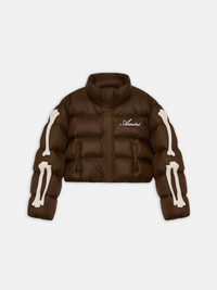 PRE-SPRING 2026 OUTERWEAR REVIVES THE BONES MOTIF, AN AMIRI SIGNATURE TRACING BACK TO THE HOUSE'S ORIGINS IN A ONE-ROOM ATELIER ON L.A.'S ICONIC SUNSET BOULEVARD. THE BONES CROPPED DOWN JACKET IS CONSTRUCTED WITH SIDE POCKETS, PATCH APPLIQUES, ZIP AND SNAP BUTTON CLOSURE, AND AMIRI LOGO AT CHEST. PRE-SPRING 2025 COLLECTION MADE IN ROMANIA 100% NYLON THIS GARMENT HAS UNDERGONE A SPECIAL PROCESS WHICH RESULTS IN INTENTIONAL VARIATIONS OF SHADING AND COLOR, AND ADD TO THE PIECE'S UNIQUE CHARACTERISTICS. THIS MAY LEAD TO BLEEDING OR DYE TRANSFER. PLEASE USE CAUTION WHEN WASHING OR DRY-CLEANING THIS ITEM STYLE:AWOUDW1003-200 SIZE & FIT PRODUCT MEASUREMENTS: CHEST: 52.75" SHOULDER: 20" LENGTH: 20" SLEEVE LENGTH: 34.5"