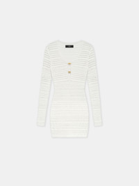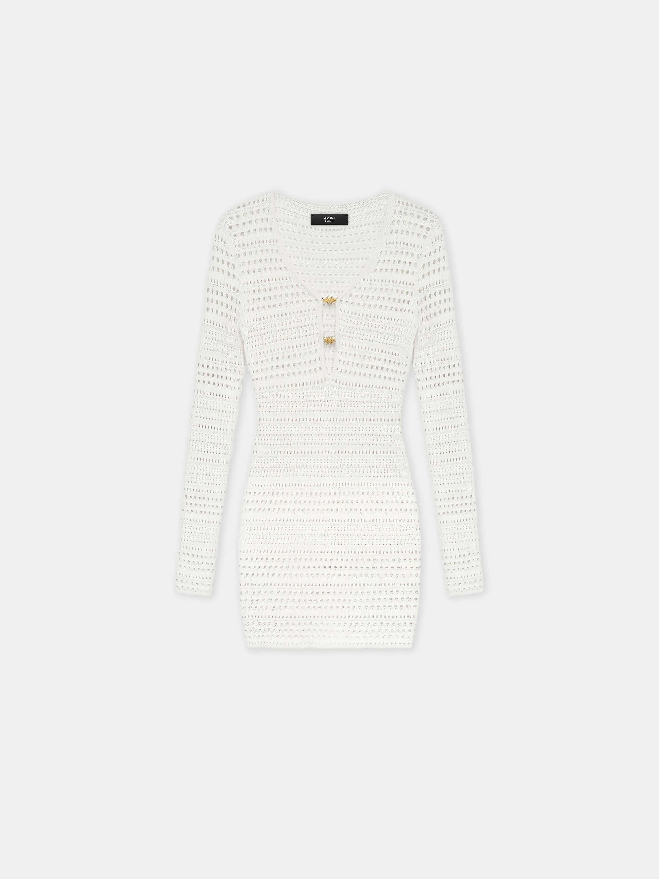 PRE-FALL 2025 INTRODUCES NEW WOMENSWEAR SILHOUETTES ENRICHED WITH THE SPIRIT OF ARTISANAL CRAFT. THE CROCHET MINI DRESS IN COTTON IS DESIGNED IN A FORM-FITTING SILHOUETTE WITH A DOUBLE KEYHOLE NECKLINE FEATURING MA ICON HARDWARE. PRE-FALL 2025 COLLECTION MADE IN ITALY 100% COTTON THIS GARMENT HAS UNDERGONE A SPECIAL PROCESS WHICH RESULTS IN INTENTIONAL VARIATIONS OF SHADING AND COLOR, AND ADD TO THE PIECE'S UNIQUE CHARACTERISTICS. THIS MAY LEAD TO BLEEDING OR DYE TRANSFER. PLEASE USE CAUTION WHEN WASHING OR DRY-CLEANING THIS ITEM STYLE:AWKNRS1031-127 SIZE & FIT MODEL IS WEARING SIZE XS MODEL MEASUREMENTS: HEIGHT: 5'9.5” CHEST: 30" WAIST: 23" HIP: 34.5" PRODUCT MEASUREMENTS (SIZE XS): CHEST: 28" SHOULDER: 14.5" LENGTH: 31" SLEEVE LENGTH: 23.75"