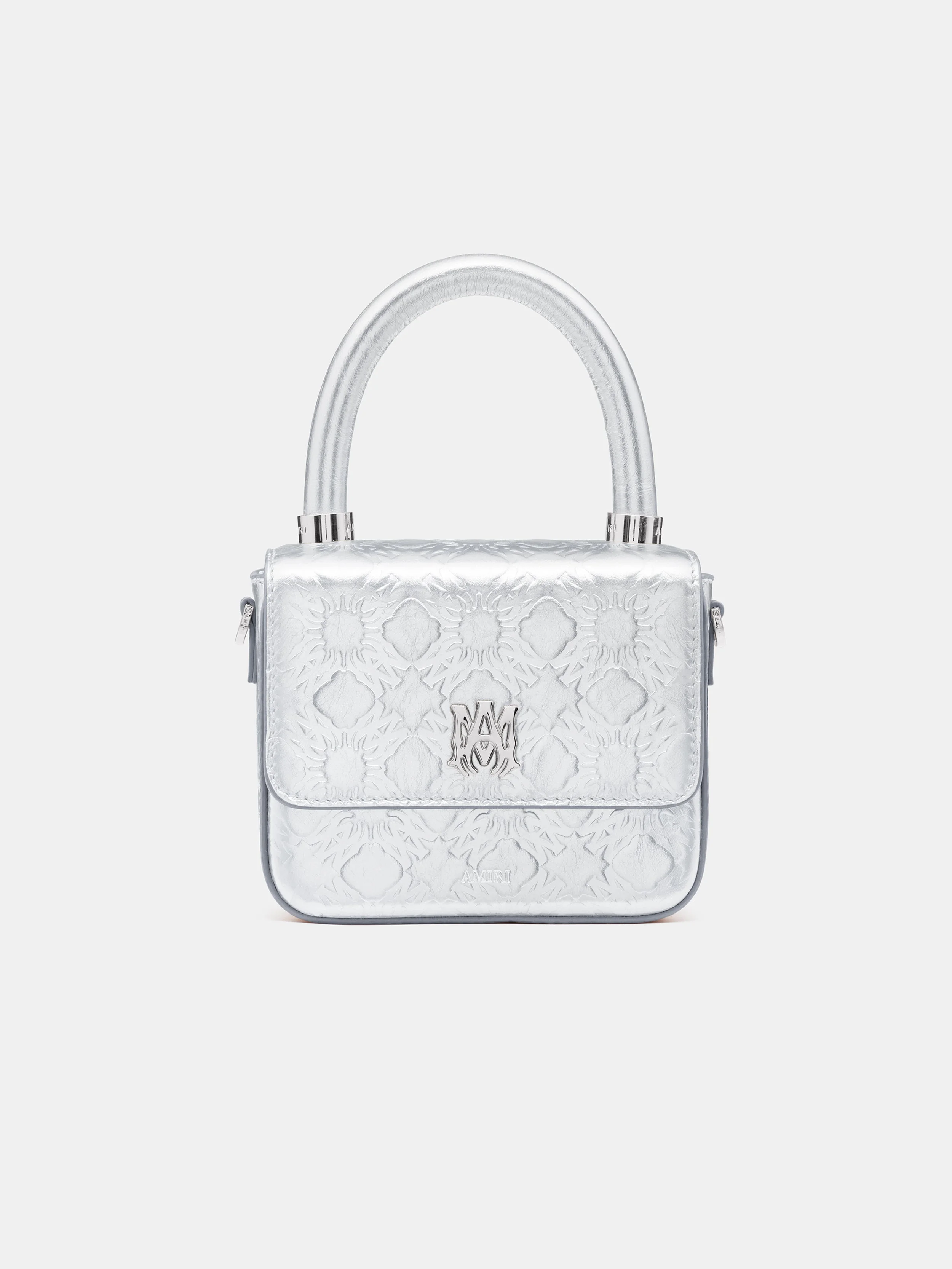 THE HOUSE'S SIGNATURE MICRO MA BAG APPEARS IN A HIGH-SHINE METALLIC LEATHER RENDITION FOR PRE-SPRING 2026. THE MA QUAD MICRO MA BAG IS CRAFTED IN DEBOSSED MA QUAD-PRINT LEATHER AND FINISHED WITH MAGNETIC CLOSURE, MA ICON HARDWARE, A LEATHER TOP HANDLE, AND A DETACHABLE LEATHER SHOULDER STRAP. PRE-SPRING 2026 COLLECTION MADE IN ITALY 100% LEATHER EACH PIECE IS METICULOUSLY CRAFTED AND INHERENTLY UNIQUE. SLIGHT VARIATIONS IN THE ARTWORK ARE A NATURAL RESULT OF THE PRINTING PROCESS AND CONTRIBUTE TO THE DISTINCTIVE CHARACTER OF THIS PRODUCT. STYLE:AWHABA1012-040 SIZE & FIT PRODUCT MEASUREMENTS: WIDTH: 5.75" HEIGHT: 5" DEPTH: 2.4"