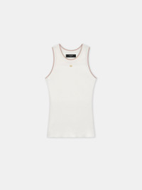 THE SPRING-SUMMER 2025 WOMENSWEAR COLLECTION CONTINUES TO EXPLORE HOUSE SIGNATURE MOTIFS IN STREAMLINED SILHOUETTES. THE OPEN BACK TANK IS DESIGNED IN A VARIEGATED RIB WITH CONTRAST TRIM AND MA ICON HARDWARE AT THE CHEST. SPRING-SUMMER 2025 COLLECTION MADE IN ITALY VISCOSE/POLYAMIDE STYLE:AWKNTT1018-127 SIZE & FIT PRODUCT MEASUREMENTS (SIZE "S"): CHEST: 13.75" SHOULDER: 8.75" LENGTH: 24"