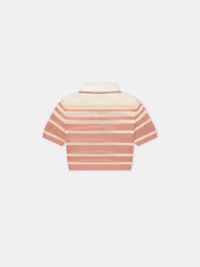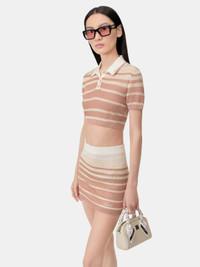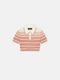 THE VISUAL CUES OF COURT ATHLETICS ARE ADAPTED WITH HOUSE SIGNATURE GRAPHICS FOR PRE-FALL 2025. THE STRIPE CROPPED POLO IS CRAFTED IN POINTELLE TUCK STITCH AND FEATURES RIB FINISHES, CONTRAST TIPPING AT THE COLLAR, AND THREE-BUTTON CLOSURE. PRE-FALL 2025 COLLECTION MADE IN ITALY 100% VISCOSE THIS GARMENT HAS UNDERGONE A SPECIAL PROCESS WHICH RESULTS IN INTENTIONAL VARIATIONS OF SHADING AND COLOR, AND ADD TO THE PIECE'S UNIQUE CHARACTERISTICS. THIS MAY LEAD TO BLEEDING OR DYE TRANSFER. PLEASE USE CAUTION WHEN WASHING OR DRY-CLEANING THIS ITEM STYLE:AWKNPO1023-805 SIZE & FIT MODEL IS WEARING SIZE XS MODEL MEASUREMENTS: HEIGHT: 5'9.5” CHEST: 30" WAIST: 23" HIP: 34.5" PRODUCT MEASUREMENTS (SIZE XS): CHEST: 31.5" SHOULDER: 14.25" LENGTH: 13.875" SLEEVE LENGTH: 7.375"