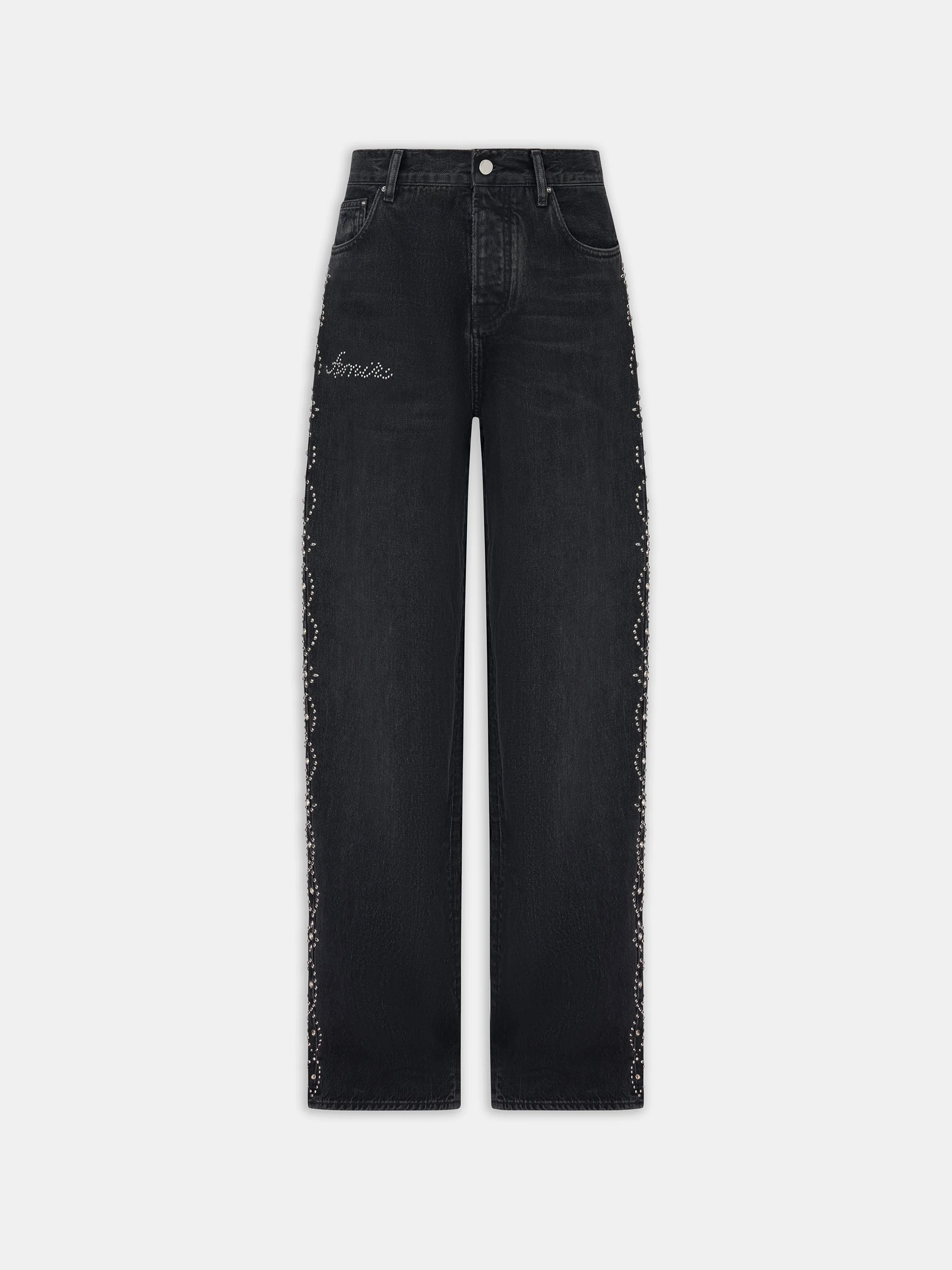 FOR PRE-SPRING 2026 WOMENSWEAR, HOUSE SIGNATURE DENIM IS MADE MEMORABLE WITH RHINESTONE RIVETS AND STARBURST STUD EMBELLISHMENTS. THE STUD BAGGY JEAN FEATURES CLASSIC FIVE-POCKET CONSTRUCTION AND IS FINISHED WITH A STUD RENDITION OF THE HOUSE SCRIPT LOGO. PRE-SPRING 2026 COLLECTION MADE IN ITALY 100% COTTON THIS GARMENT HAS UNDERGONE A SPECIAL PROCESS WHICH RESULTS IN INTENTIONAL VARIATIONS OF SHADING AND COLOR, AND ADD TO THE PIECE'S UNIQUE CHARACTERISTICS. THIS MAY LEAD TO BLEEDING OR DYE TRANSFER. PLEASE USE CAUTION WHEN WASHING OR DRY-CLEANING THIS ITEM STYLE:AWBMJE1016-572