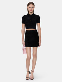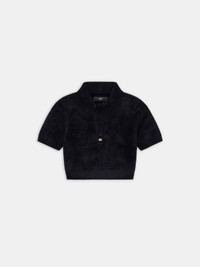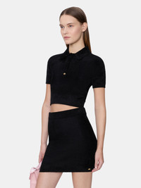 FOR AUTUMN-WINTER 2025, STREAMLINED SILHOUETTES ARE ELEVATED IN PLUSH VELVET. THE VELVET POLO IS DESIGNED IN A CROPPED FIT AND FINISHED WITH THREE-BUTTON CLOSURE, FINE RIB ACCENTS, AND CUSTOM MA HARDWARE. AUTUMN-WINTER 2025 COLLECTION MADE IN ITALY 66% VISCOSE, 34% NYLON THIS GARMENT HAS UNDERGONE A SPECIAL PROCESS WHICH RESULTS IN INTENTIONAL VARIATIONS OF SHADING AND COLOR, AND ADD TO THE PIECE'S UNIQUE CHARACTERISTICS. THIS MAY LEAD TO BLEEDING OR DYE TRANSFER. PLEASE USE CAUTION WHEN WASHING OR DRY-CLEANING THIS ITEM STYLE:AWKNPO1031-001 SIZE & FIT MODEL MEASUREMENTS: HEIGHT: 5’9.5" CHEST: 32" WAIST: 23" HIP: 34" PRODUCT MEASUREMENTS (SIZE XS): CHEST: 31.5" SHOULDER: 14.25" LENGTH: 13.875" SLEEVE LENGTH: 7.375"