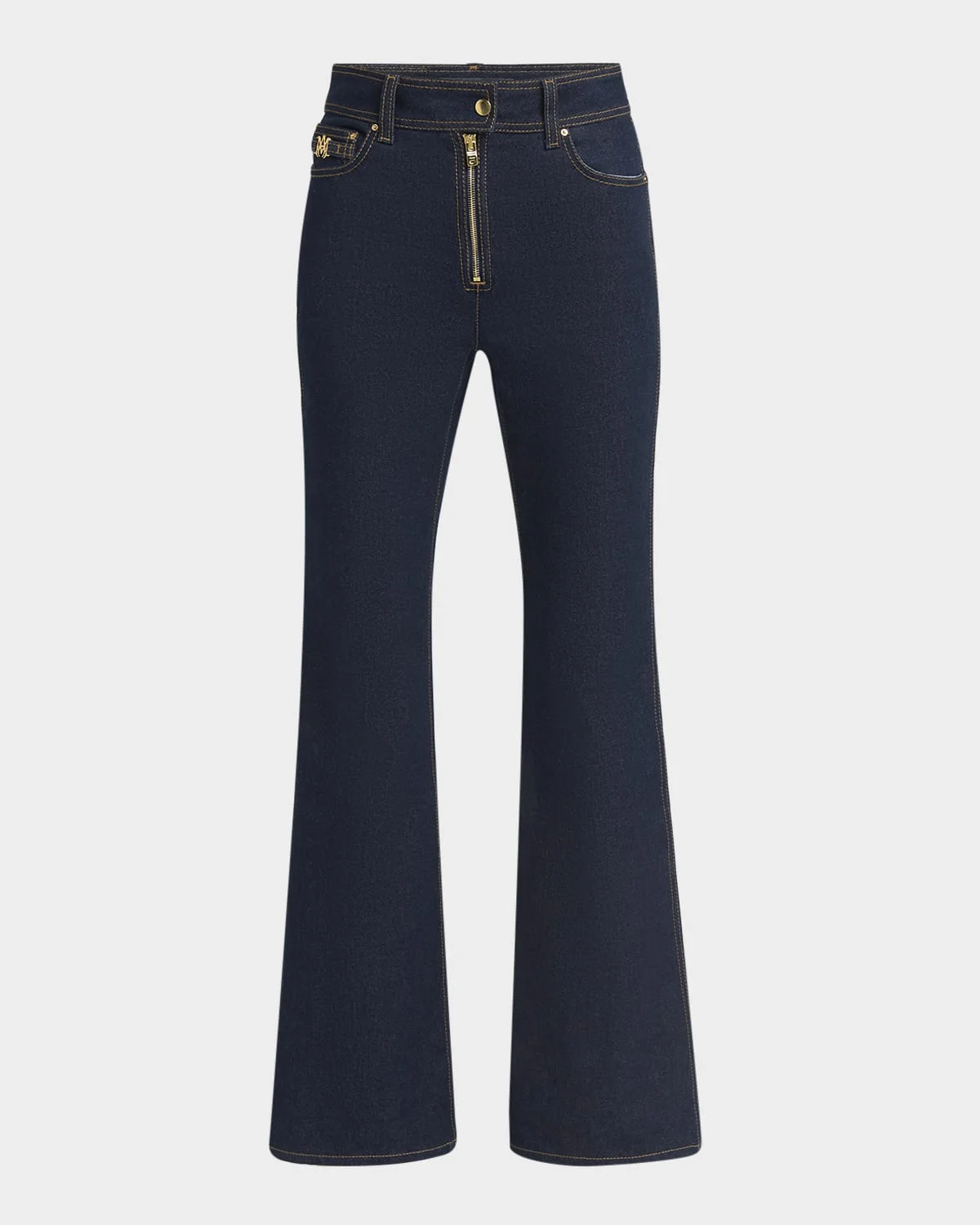 - Amiri jeans in dark-wash denim with gold-tone hardware and contrasting stitching - Mid rise sits high on hip - Five-pocket style - Full length - Flared legs - Snap/zip fly; belt loops - Cotton/elastane - Dry clean - Made in Italy