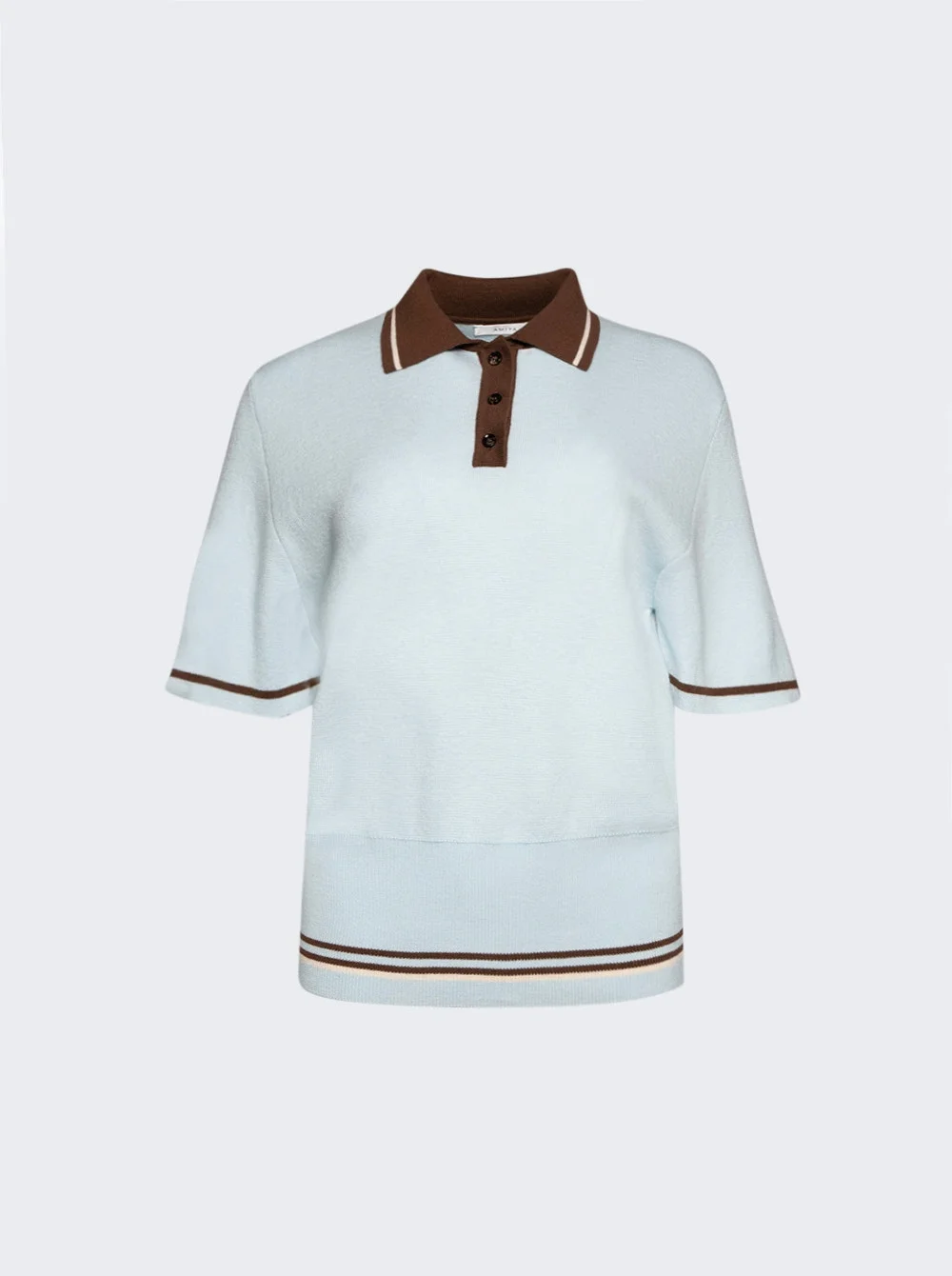 Details - Short-sleeve wool polo top - Smooth, lightweight knit - Contrast brown collar and placket - Horn buttons - Stripe trim art the cuffs and hem - Material: 100% Wool Size Information: Vendor Color Code: Brand Style: AM32 Designer/Brand: AMIYA