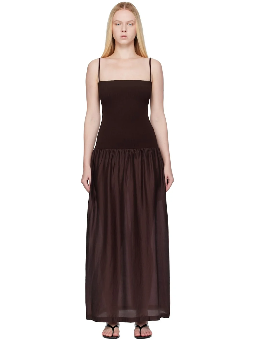 Ribbed crepe and lightweight semi-sheer poplin maxi dress. · Straight neck · Gathering at dropped waist · Seam pockets · Elasticized shoulder straps · Central vent at back hem Supplier color: Burgundy Body 1: 83% rayon, 17% polyester. Body 2: 84% tencel, 16% polyester. Made in South Korea 251436F055000