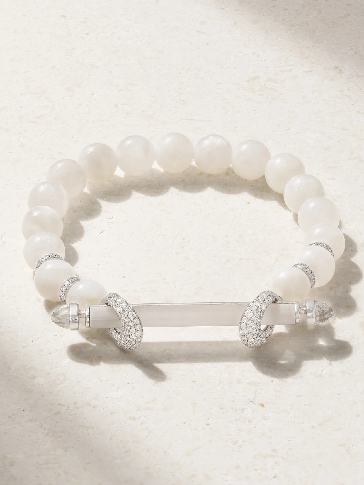 ANANYA believes that its 'Chakra' bracelets can bring 'balance and healing' to anyone who wears them. This one is crafted from 18-karat white gold and strung with milky moonstones as a symbol of protection and creativity. Frosted diamonds and quartz crystal tips complete the celestial feel.