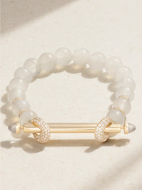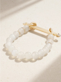 ANANYA's bracelet is part of its 'Chakra' collection, inspired by each energy center - the white color of the milky moonstone beads is associated with the mystical crown chakra, said to represent enlightenment. It features an 18-karat gold bar tipped with quartz crystals. The dusting of diamonds adds beautiful sparkle.
