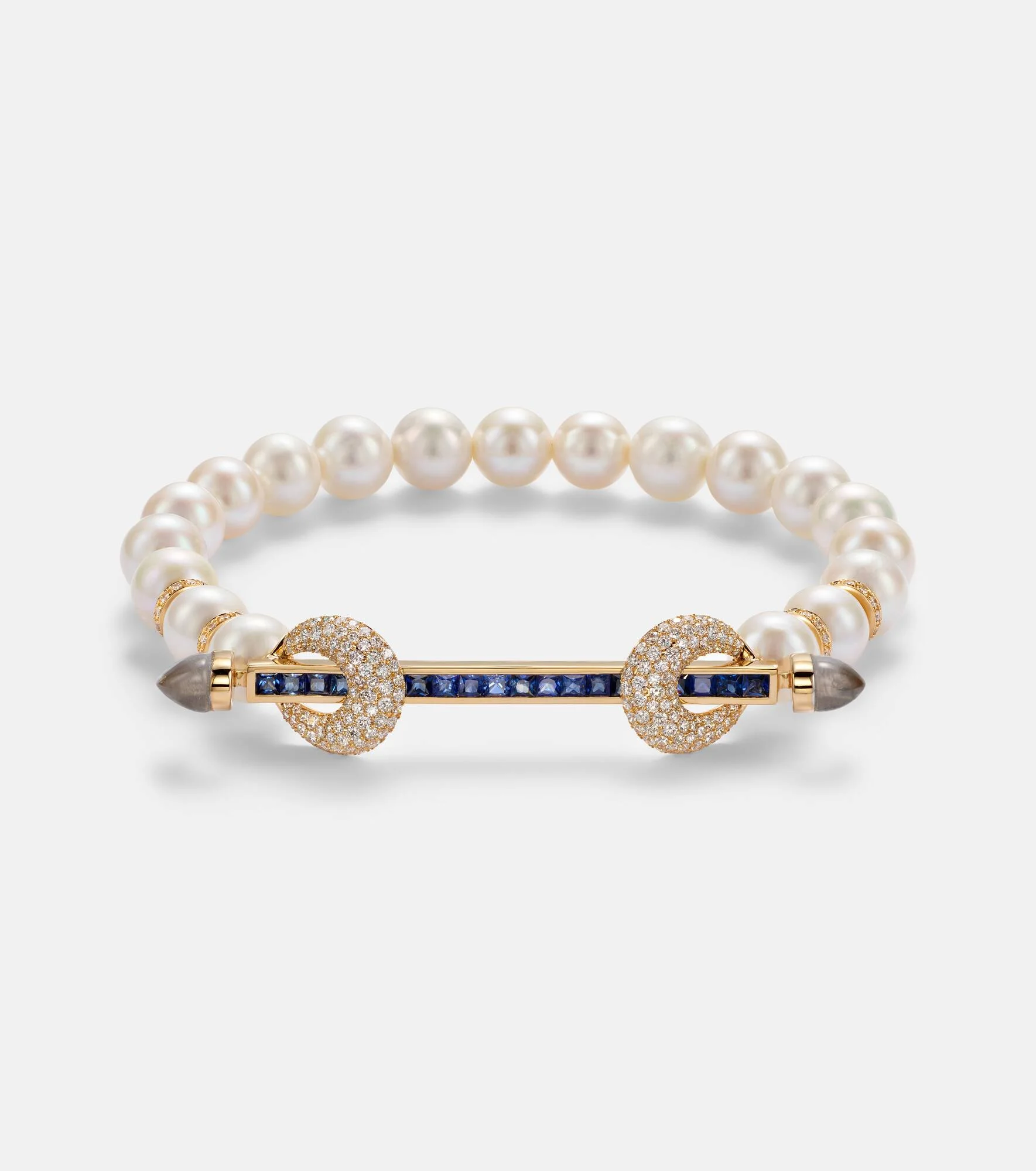A masterclass in opulent charm, Ananya’s fine jewelry draws inspiration from a rich tapestry of mythology and symbolism. Made from 18kt yellow gold (750/1000), the Chakra bracelet is adorned with sophisticated freshwater pearls and features a sapphire-embellished bar with quartz tips threaded through diamond-encrusted loops. Product Details - Material: 18kt yellow gold (750/1000) - Made in Thailand - Item color: gold - Color: gold - Pearl I: freshwater - Stone I: sapphires, 69.36ctw, channel setting - Stone II: diamonds, 1.14ctw, round-cut, pave setting, G color grade, H color grade, VVS-VS clarity grade - Stone III: quartzes - This piece features natural diamonds only - diamond, sapphire - Item number: P01119031 Size & Fit - Max. width 11mm-0.45" - Elasticated band