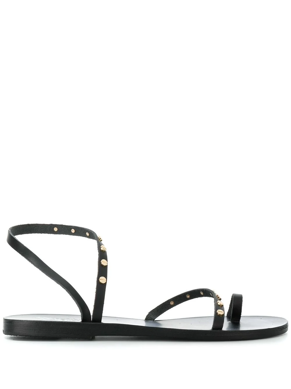 Apli studded sandals Black leather Apli studded sandals from Ancient Greek Sandals featuring an open toe, a gold-tone stud detailing, a strappy design and a flat leather sole. POSITIVELY CONSCIOUS: Ancient Greek Sandals scores 3 out 5 by independent ethical brand rating agency Good On You. It manufactures locally to reduce its carbon footprint, uses low impact non-toxic dyes and visits suppliers regularly in its supply chain. Imported Composition Outer: Calf Leather 100% Lining: Calf Leather 100% Sole: Calf Leather 100%
