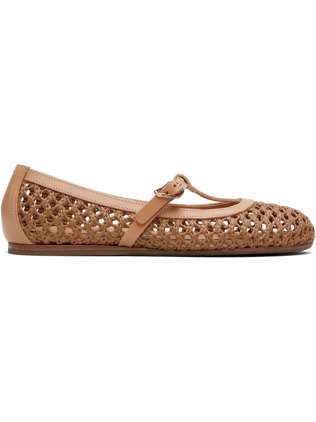 Handcrafted woven raffia and buffed Vachetta leather ballerina flats. · Pin-buckle strap at vamp · Logo embossed at padded leather footbed · Treaded rubber sole Supplier color: Brown Upper: raffia, leather. Sole: rubber. Made in Greece 261674F118000