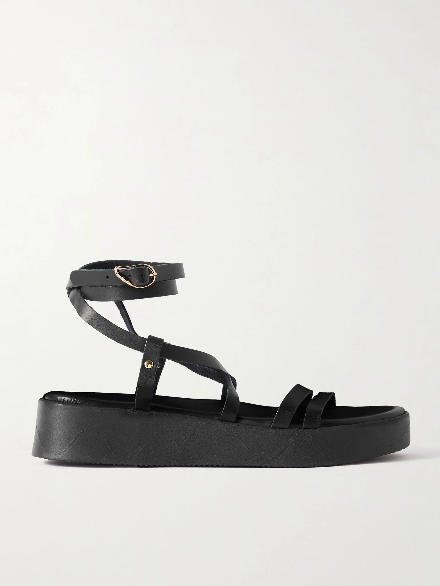 Ancient Greek Sandals' footwear is handmade by dedicated artisans in Greece, ensuring utmost attention to detail and craft. These leather 'Aristea' sandals are designed with slim straps that cross-over at the arch and wrap around the ankle. The padded platform soles offer 30mm of lift. Don't miss the signature wing-shaped buckle. Size & Fit - Fits true to size, take your normal size - Only available in full sizes, go up to the nearest whole size if you take a half size - Italian sizing Details & Care - Rubber sole measures approximately 30mm/ 1 inch - Black leather (Calf) - Buckle-fastening ankle strap