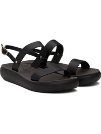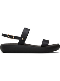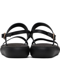 Handcrafted chemical-free buffed leather flat sandals in black. · Raw edges throughout · Open toe · Pin-buckle ankle strap · Logo embossed at padded suede footbed · Logo-embossed rubber sole Supplier color: Black Upper: leather. Sole: rubber. Made in Greece 251674F124044