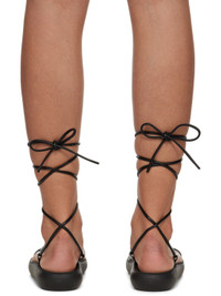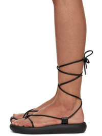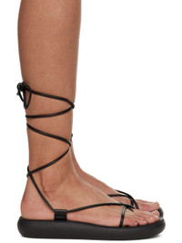Handcrafted grained leather flat sandals in black. · Criss-crossing straps at vamp · Self-tie wraparound ankle straps · Logo embossed at molded faux-leather footbed · Rubber platform midsole · Textured rubber sole · Platform: H1.25" Supplier color: Black Upper: leather, synthetic. Sole: rubber. Made in Greece 241674F124049