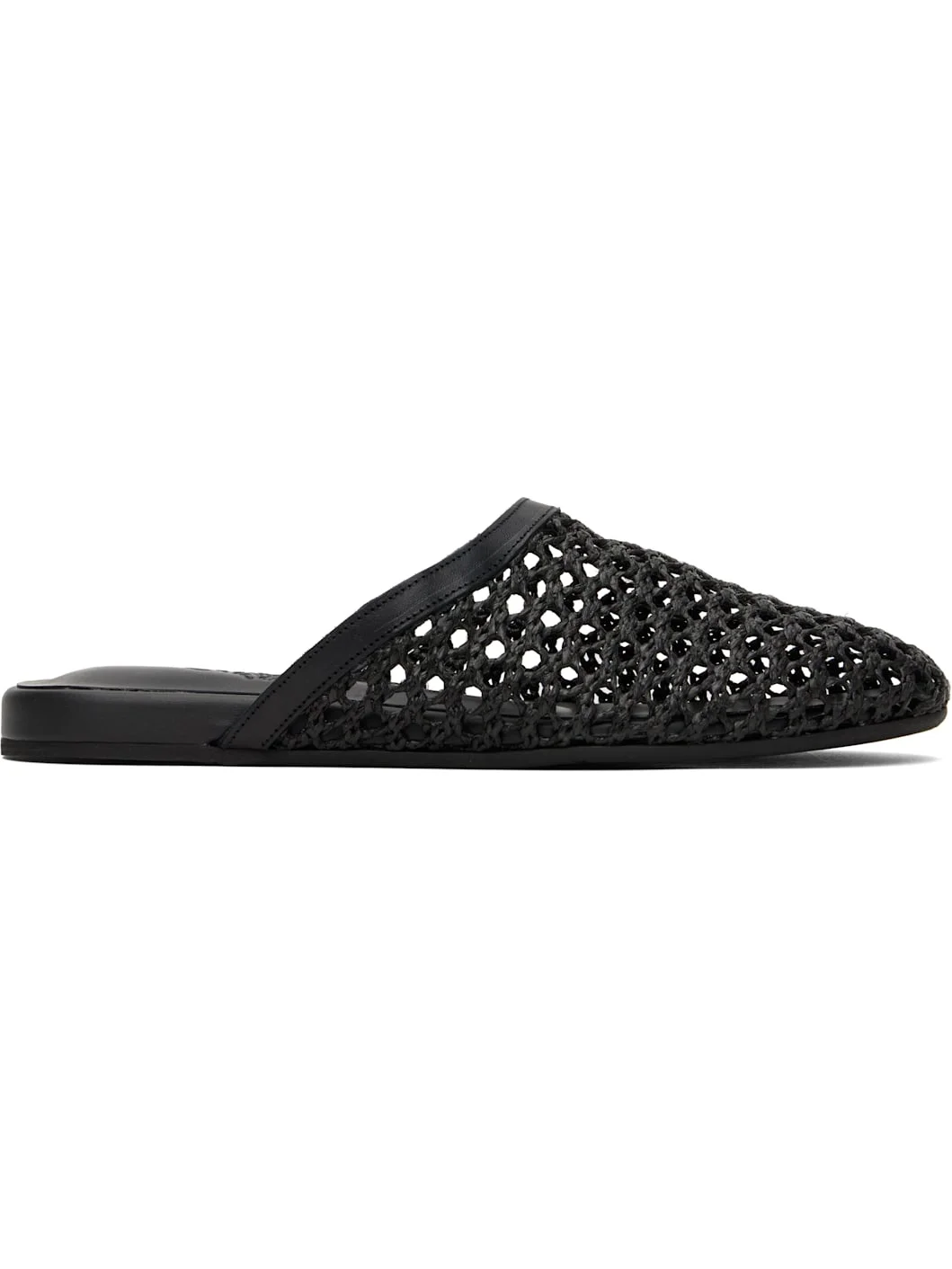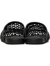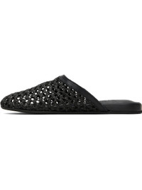 Handcrafted woven raffia and buffed leather slippers in black. · Logo embossed at padded leather footbed · Treaded rubber sole Supplier color: Black Upper: textile, leather. Sole: rubber. Made in Greece 251674F121016