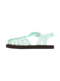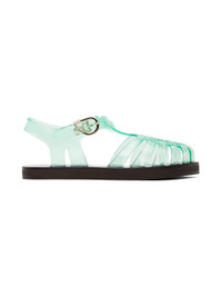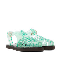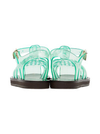 Handcrafted woven transparent PVC sandals in blue. · Cutouts throughout · Logo pin-buckle ankle strap · Logo embossed at leather footbed · Hand-stitched stacked leather midsole · Logo-embossed rubber sole Supplier color: Clear aqua Upper: polyvinyl chloride. Sole: leather, rubber. Made in Greece 242674F124002