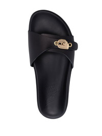 Odi open-toe slides Highlights - Black - Calf leather - Open toe - Crossover strap at the toe - Gold-tone clasp fastening - Slip-on style - Flat sole Imported Composition Leather 100% SIZE & FIT Measurement HEEL 0.78 in(2 cm) Sole height 0.59 in(1.5 cm)