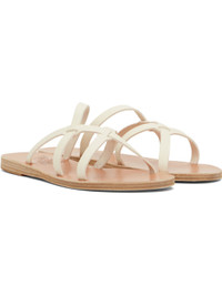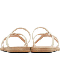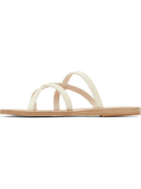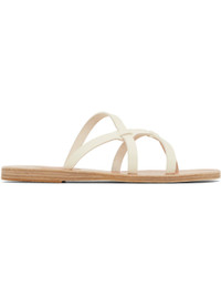 Handcrafted chemical-free buffed leather flat sandals in off-white. · Open toe · Sliding crisscrossing straps at vamp · Logo embossed at footbed · Stacked leather sole with rubber injection Supplier color: Off white Upper: leather. Sole: leather, rubber. Made in Greece 251674F124070