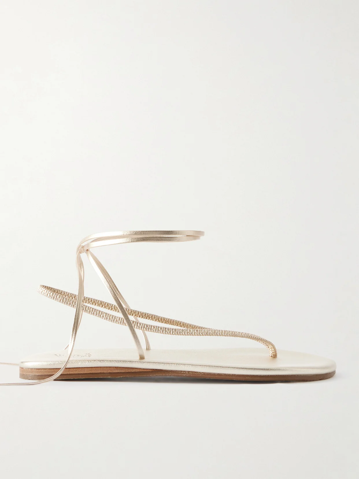 Ancient Greek Sandals' 'Sfendoni' sandals are designed with slim gold synthetic material straps that frame the foot and wrap elegantly around the ankle. They're elasticated for a comfortable fit and have rounded toes and slight heels.