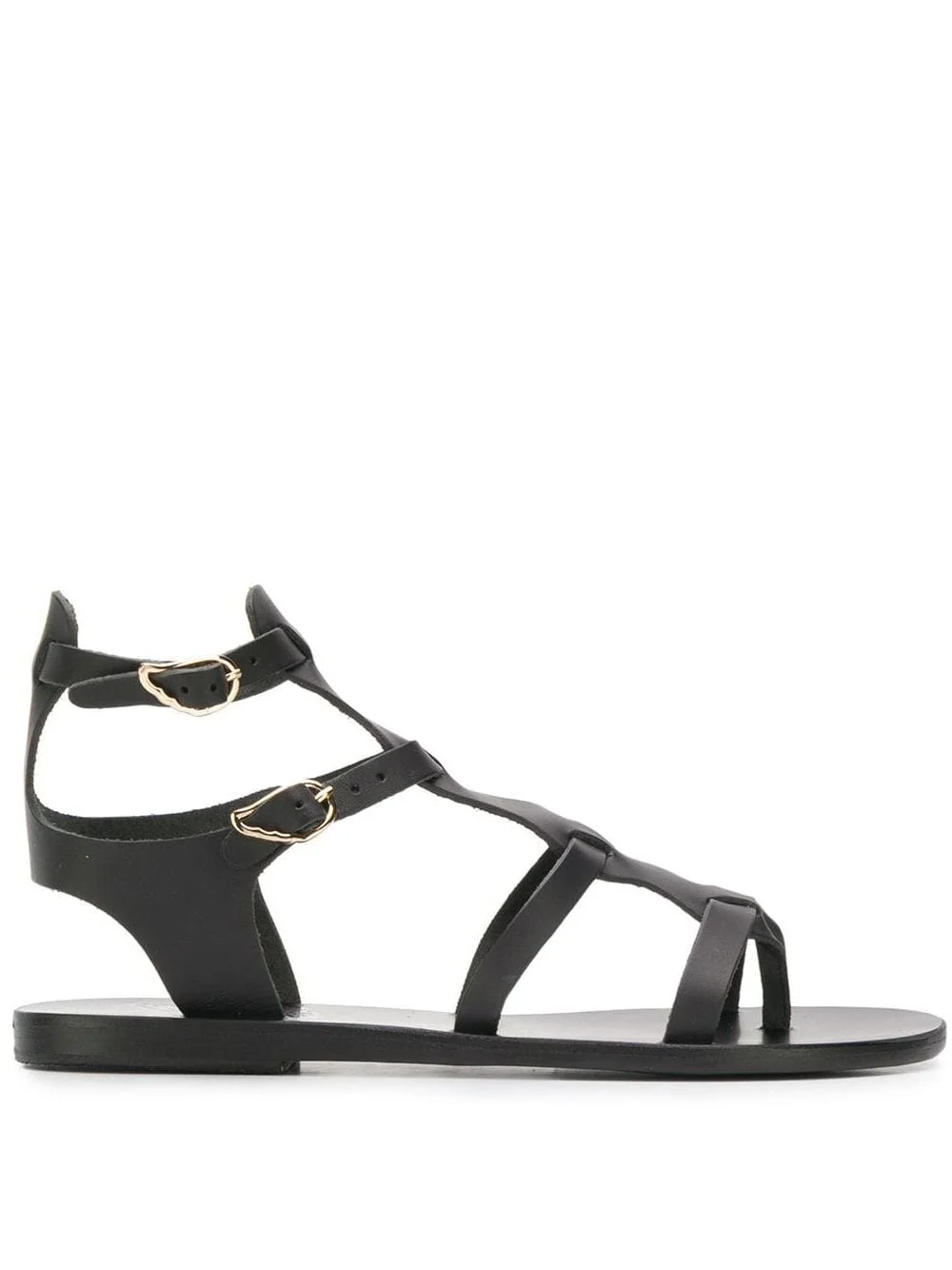 Stephanie sandals Black bos taurus and leather Stephanie sandals from Ancient Greek Sandals featuring an open toe, a strappy design, an ankle strap with a side buckle fastening, a branded insole and a flat sole. POSITIVELY CONSCIOUS: Ancient Greek Sandals scores 3 out 5 by independent ethical brand rating agency Good On You. It manufactures locally to reduce its carbon footprint, uses low impact non-toxic dyes and visits suppliers regularly in its supply chain. Imported Composition Outer: Bos Taurus 100% Lining: Calf Leather 100% Sole: Calf Leather 100%, Rubber 100% SIZE & FIT Measurement HEIGHT 3.93 in(10 cm) HEEL 0.59 in(1.5 cm) CIRCUMFERENCE 9.05 in(23 cm)