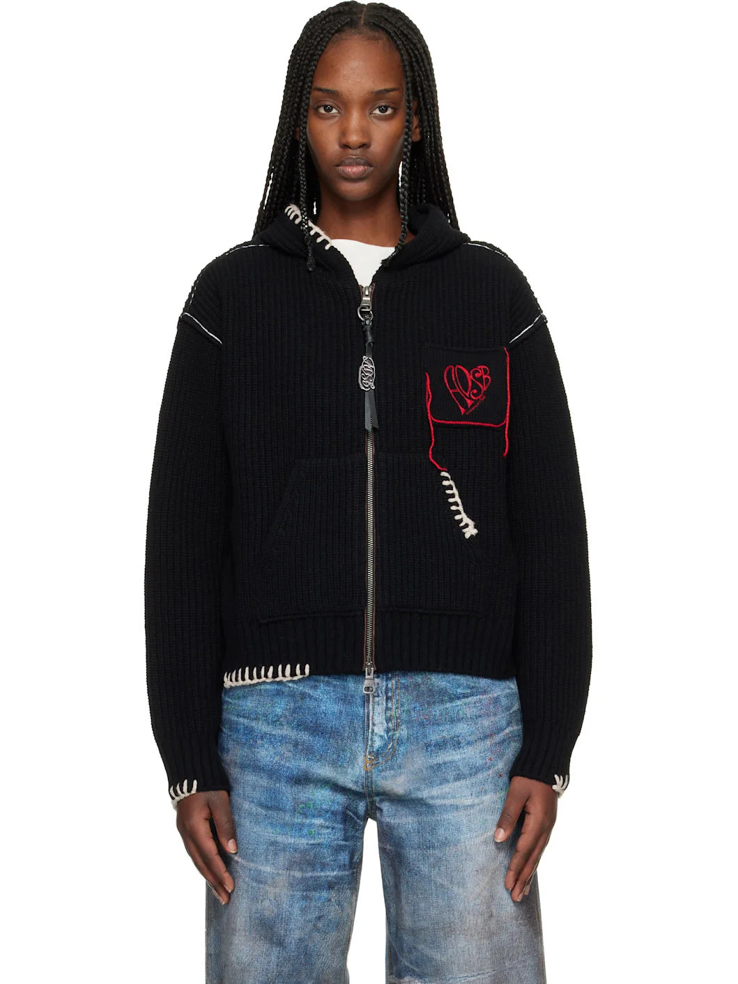 Rib-knit wool-blend hoodie. · Blanket stitching throughout · Two-way zip closure · Patch pockets at chest and waist · Logo graphic with loose threads at chest pocket · Dropped shoulders Supplier color: Black 59% wool, 36% nylon, 5% cashmere. Made in South Korea 261375F097001
