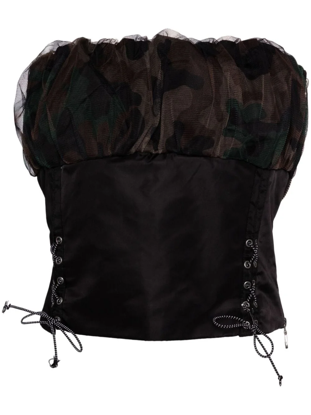 ISLA shirred crop bustier Highlights - Black/multicolor - Shirred effect - Lace-up detailing - Camouflage print - Cropped - Side zip fastening - Straight hem Imported Composition Outer: Nylon 100% Lining: Polyester 100% Filling: Polyester 100% SIZE & FIT Measurement LENGTH 11.02 in(28 cm) BUST 26.77 in(68 cm) Washing instructions Dry Clean Only