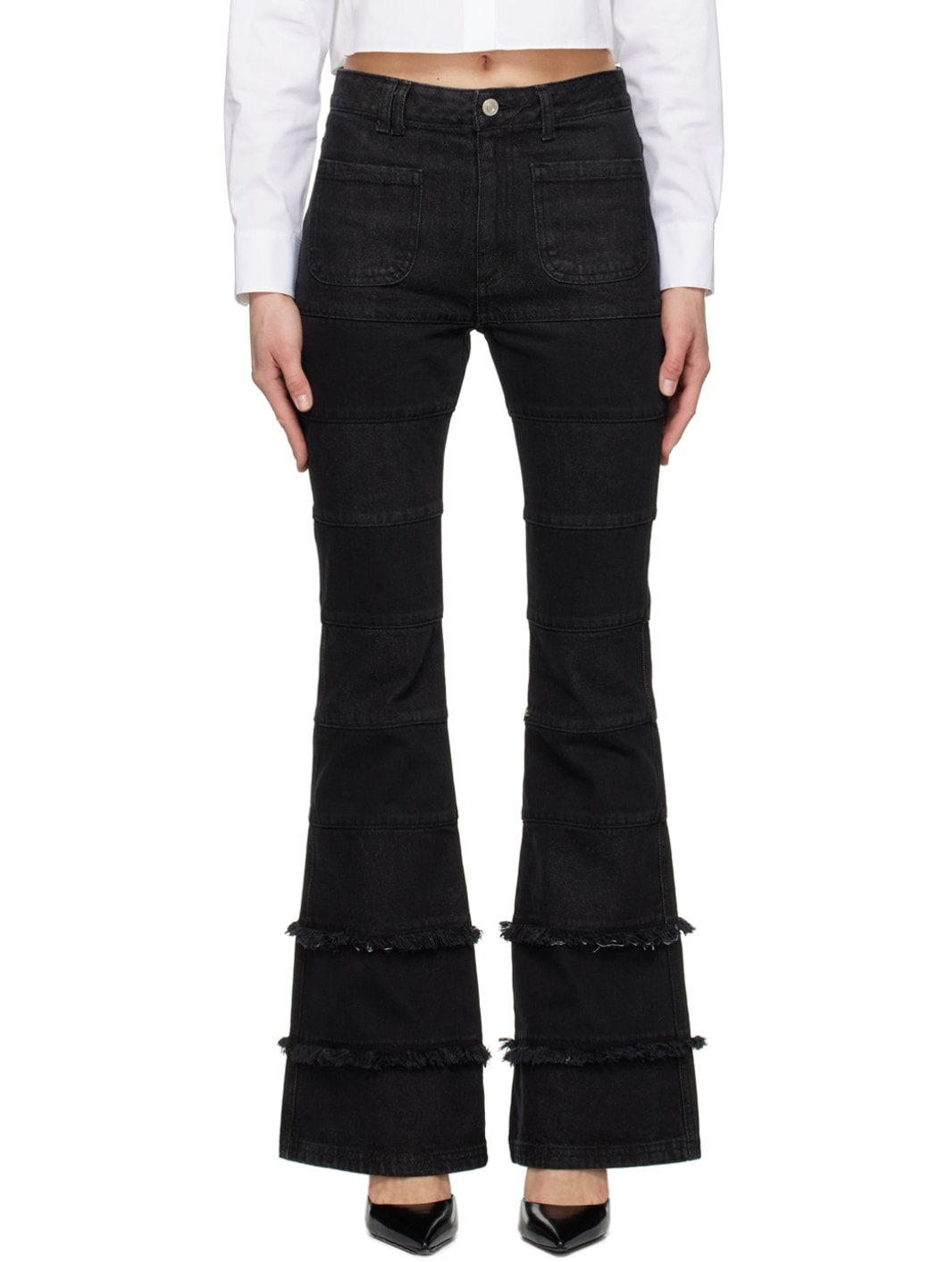 Non-stretch denim jeans. · Paneled construction · Belt loops · Four-pocket styling · Zip-fly · Fringed detailing at flared cuffs · Leather logo patch at back waistband · Logo-engraved silver-tone hardware Supplier color: Black