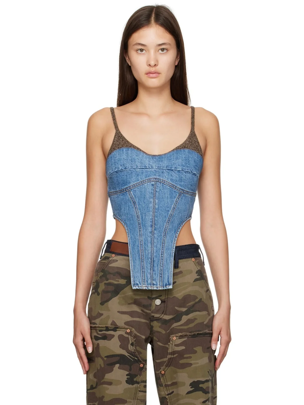 Non-stretch denim bustier-style camisole. Fading throughout. · Paneled construction · Knit scoop neck and fixed shoulder straps · Zip closure at back · Garter straps with graphic hardware at back · Contrast stitching in tan Supplier color: Washed blue Body: 100% cotton. Trim: 91% wool, 9% cashmere. Made in South Korea 232375F111000