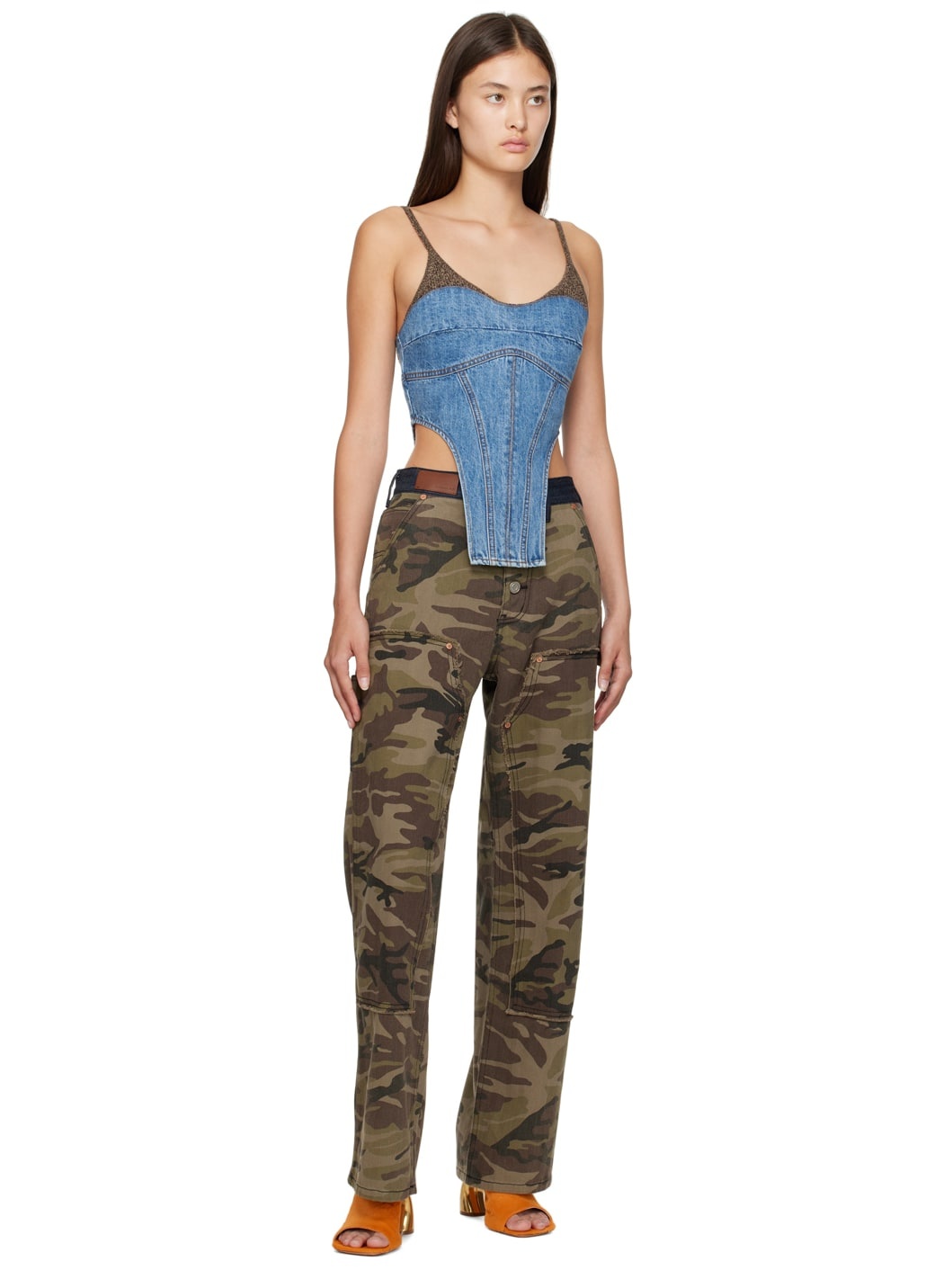 Non-stretch denim bustier-style camisole. Fading throughout. · Paneled construction · Knit scoop neck and fixed shoulder straps · Zip closure at back · Garter straps with graphic hardware at back · Contrast stitching in tan Supplier color: Washed blue