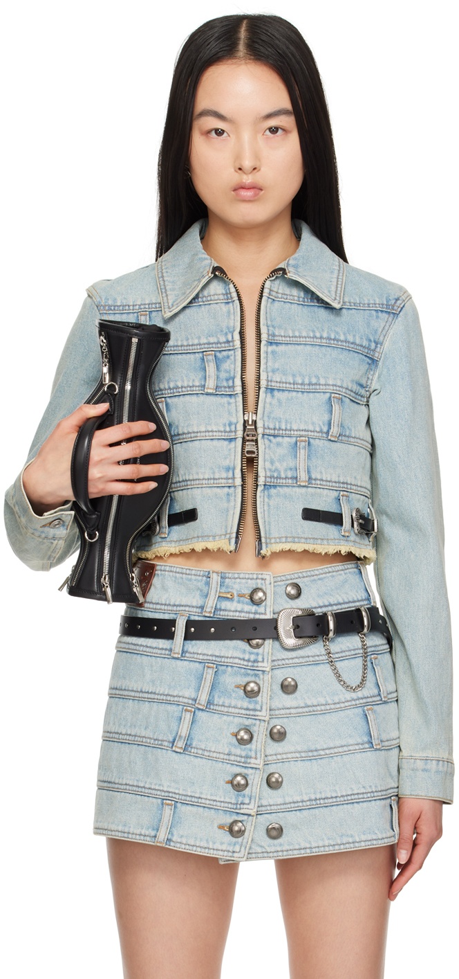 Paneled non-stretch denim jacket. Fading and belt loops throughout. · Spread collar · Two-way zip closure · Pin-buckle tabs at hem · Frayed edge at cropped hem · Single-button barrel cuffs · Leather logo patch at back hem Supplier color: Light blue