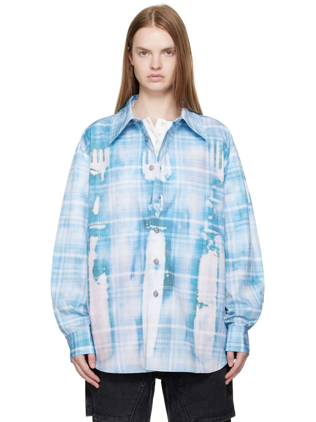 Stretch cotton-blend twill shirt. · Printed discoloration and check pattern throughout · Spread collar · Button closure · Shirttail hem · Buttoned barrel cuffs · Box pleat at back yoke Supplier color: Blue 59% cotton, 37% nylon, 4% elastane. Made in South Korea 252375F109003