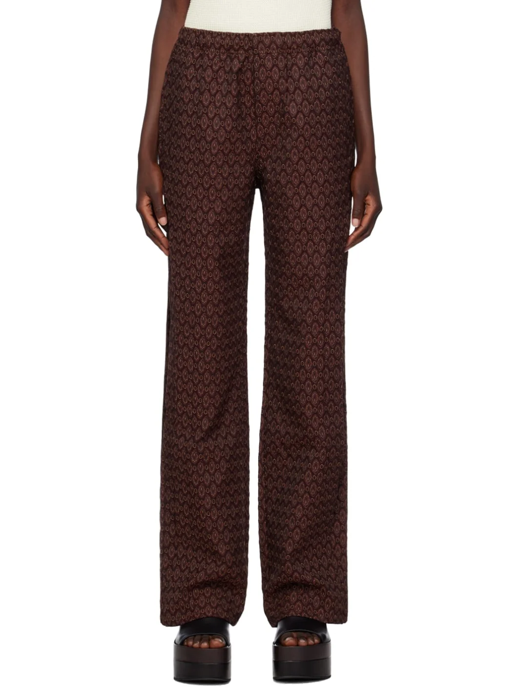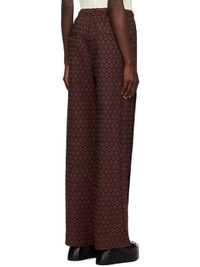 Polyester- and rayon-blend gobelin trousers. Jacquard graphic pattern throughout. · Concealed drawstring at elasticized waist · Four-pocket styling · Gusset at outseams Supplier color: Brown 60% polyester, 40% rayon. Made in South Korea 231375F087009