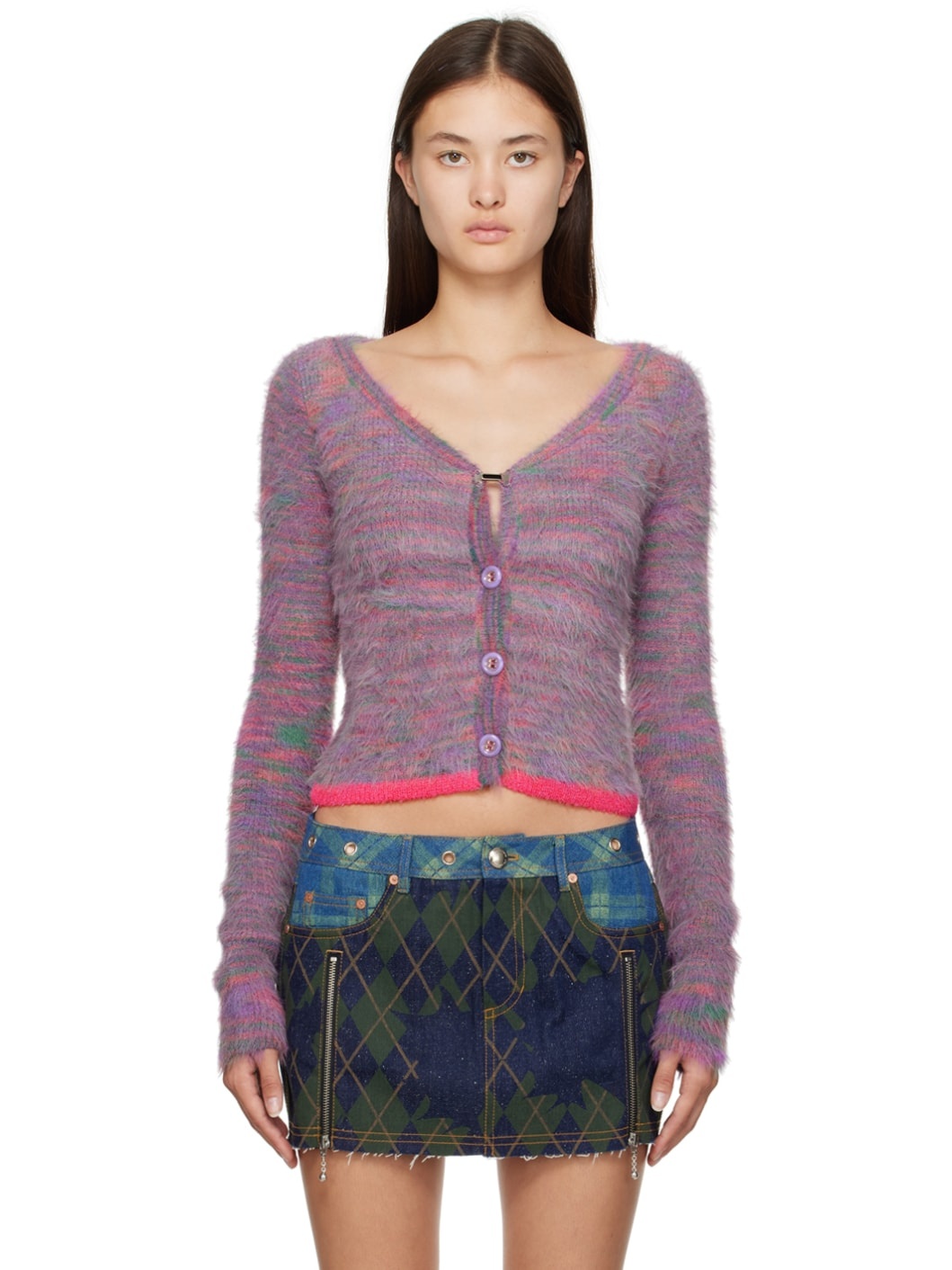 Shag rib knit nylon cardigan. Stripes throughout. · Y-neck · Hook-eye fastening at button closure Supplier color: Multi purple