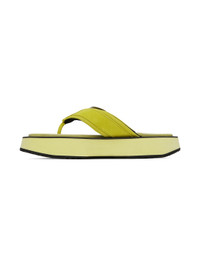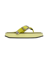 Suede sandals in green. · Open square toe · Pin-buckle detailing at thong-style strap · Logo-embossed padded leather footbed · Rubber platform midsole · Treaded rubber outsole · Platform: H1.5 in Supplier color: Green Upper: leather. Sole: rubber. Made in South Korea 231375F124001