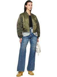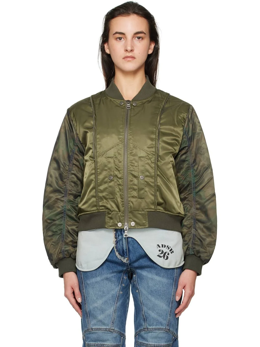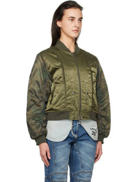 3M Thinsulate®-insulated polyester satin bomber jacket. · Paneled construction · Rib-knit stand collar, hem, and cuffs · Two-way zip closure · Zip hardware at front and back collar · Welt pockets at front · Logo flag at side seam · Camouflage pattern at mesh sleeve overlay · Ruching at sleeves · Logo patch at back collar · Welt pockets at interior Supplier color: Khaki Body: 100% polyester. Trim: 97% polyester, 3% elastane. Fill: 100% polyester. Lining: 100% polyester. Made in South Korea 242375F058000