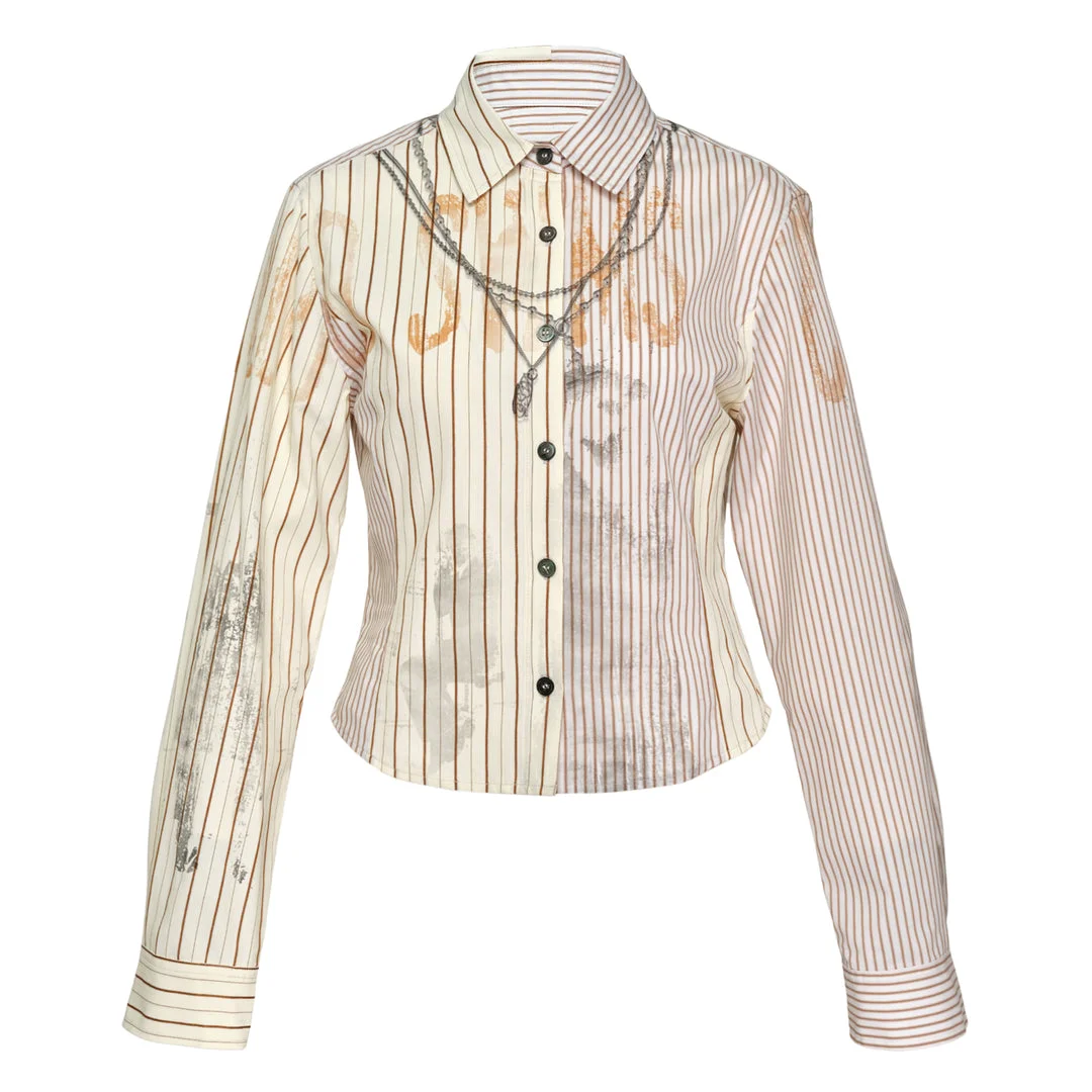 600081367BGE00L / ATB1566W/00/BEIGE - Trompe-l'oeil printed necklace and choker design - Classic point collar - Long sleeves with button cuffs - Front button closure - Pinstripe cotton construction - Fitted silhouette - Optical illusion artwork The Andersson Bell Necklace & Choker Trompe-L'Oeil Top delivers innovative fashion artistry through optical illusion design printed directly onto fabric. Crafted from premium cotton with pinstripe detailing, featuring a realistic printed jewelry motif that creates the appearance of layered necklaces and chokers. The sophisticated trompe-l'oeil technique transforms a classic button-down silhouette into a statement piece that challenges perception.