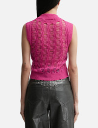 - Andersson Bell - Meadow Mohair Vest - Ribbed trims - Relaxed fit - V-neck - Sleeveless - Open-knit construction - Straight hem - Color: Fuchsia Pink - Material: 50% Nylon, 30% Mohair, 20% Wool - See more Tops and Clothing SIZING - Model wears size S - Model measures: Height 170cm, Chest 29”/75cm, Waist 22”/57cm,Hip 33”/86cm