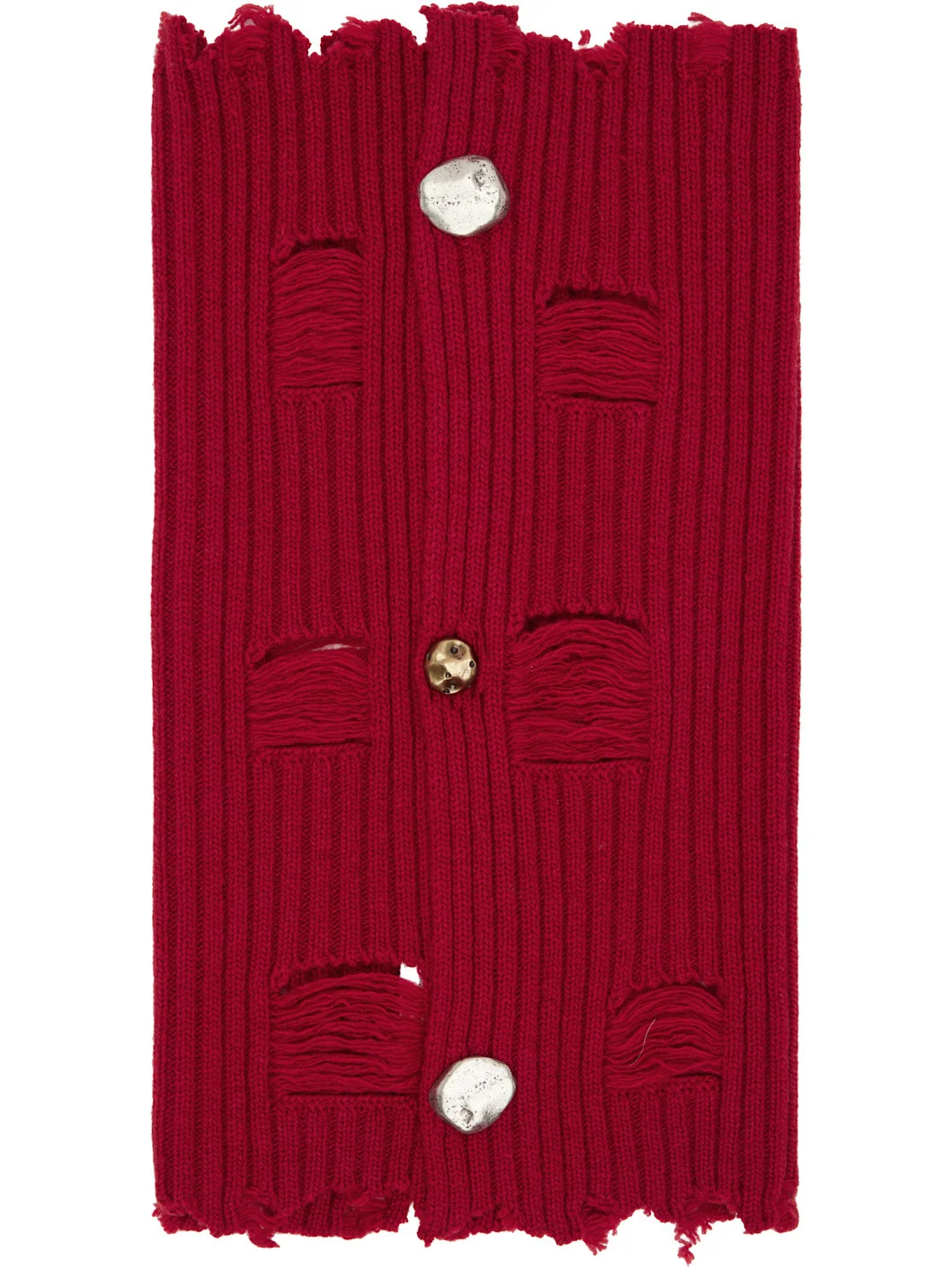 Rectangular rib-knit wool-blend tube scarf. · Laddering and raw edges throughout · Button closure · Logo patch at back face · Mismatched oxidized hardware Supplier color: Scarlet 60% wool, 35% nylon, 5% cashmere. Made in South Korea 252375F028001
